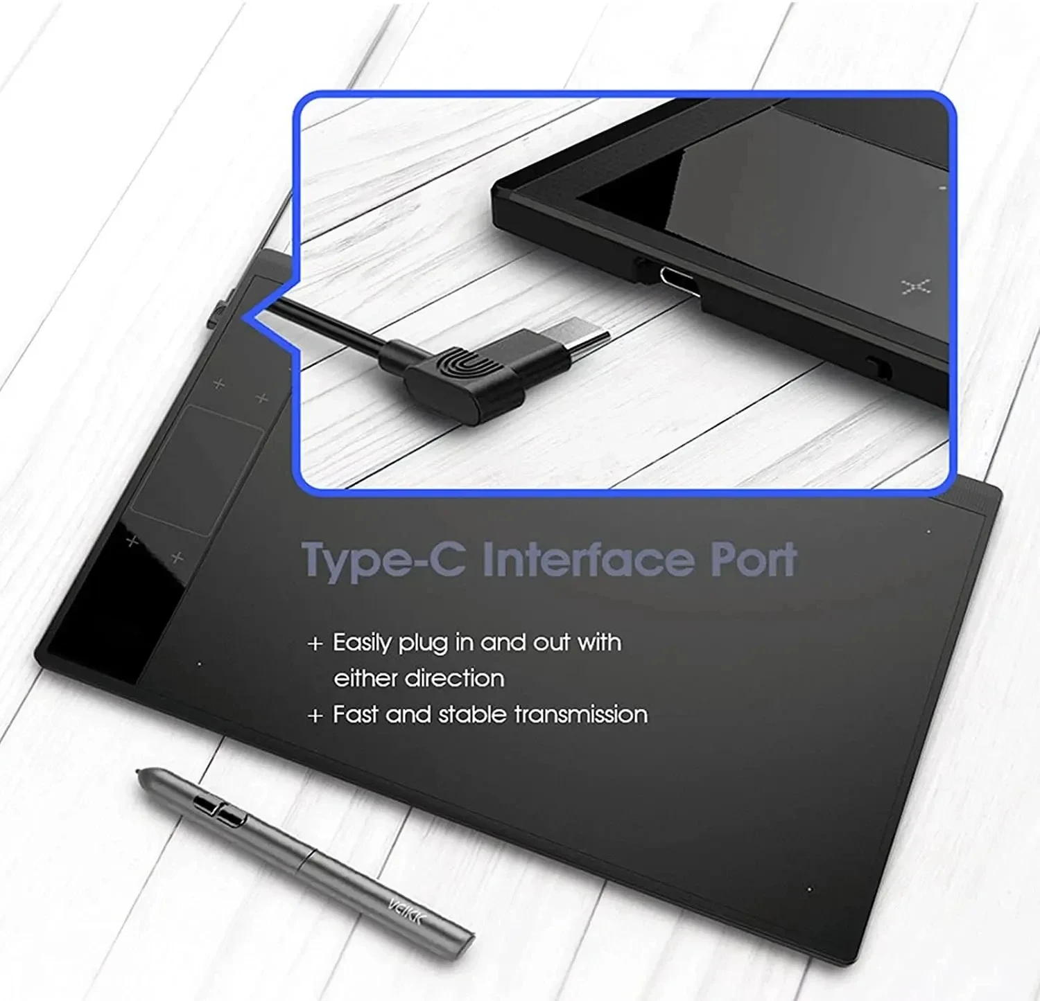 Type C Interface Port The tablet features a Type C interface for easy connection, with a reversible plug-in design. The port is durable, ensuring long-term use without loosening or poor contact. The included cable is 1.5 meters long, offering sufficient reach for comfortable use.