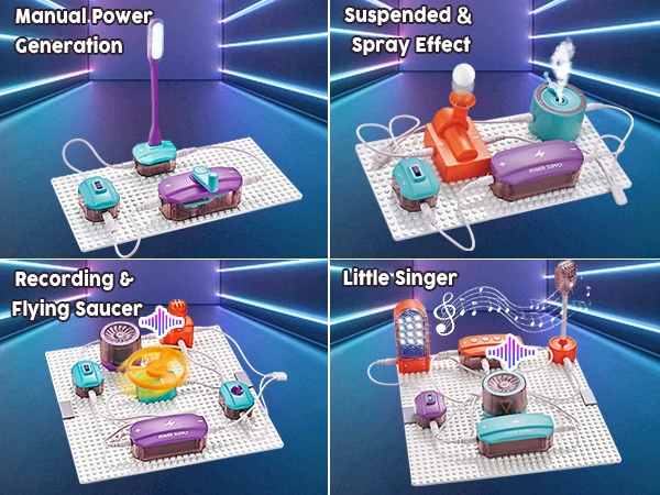 53-Piece Scientific Circuit Set – The kit includes components like power generators, hand cranks, switches, wires, resistors, and LED lights for basic circuits. It also features photo-sensitive switches, spray modules, light shows, audio components, flying saucers, fans, and karaoke microphones to enhance the experience. The variety allows children of all ages to explore from simple to complex circuit building.