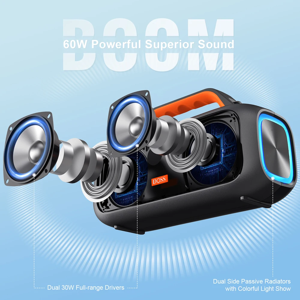 DOSS Outdoor Portable Speaker: Powerful 60W Stereo and Bass Sound, Power Bank, IPX6 Waterproof, LED Lights, TWS Wireless Speakers