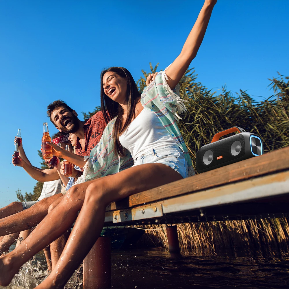 The DOSS Extreme Boom S is an outdoor, waterproof portable speaker with IPX6 water resistance, fearlessly withstanding splashes, rain, or spills. Its portable handle and shoulder strap design allow you to take your music wherever you want. The dynamic light show takes your party to another level. It is equipped with a built-in 9000mAh power bank, which can charge your device while you are on the move, ensuring that the music never stops.