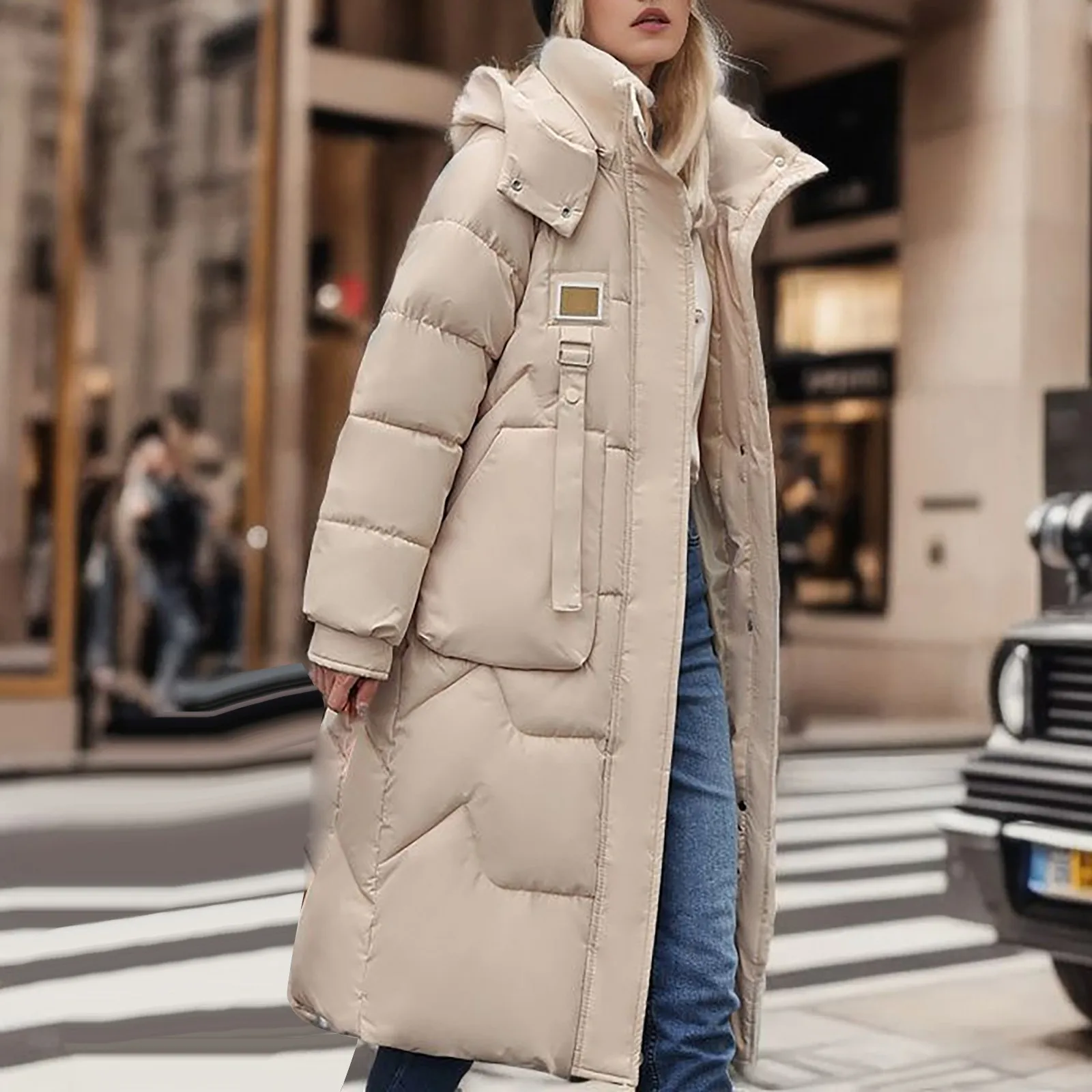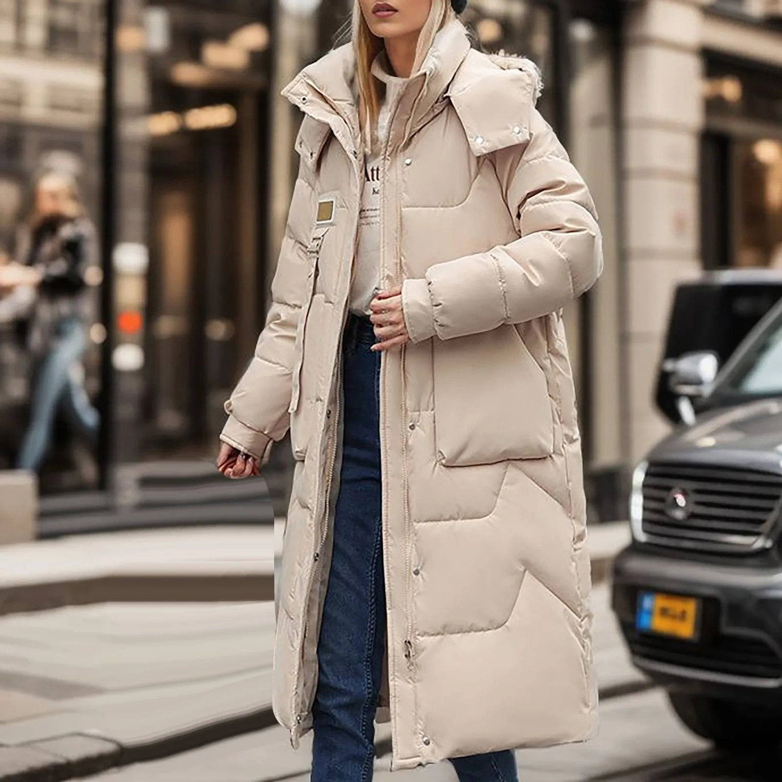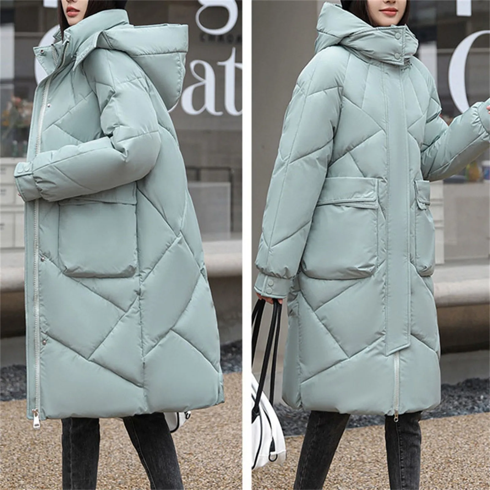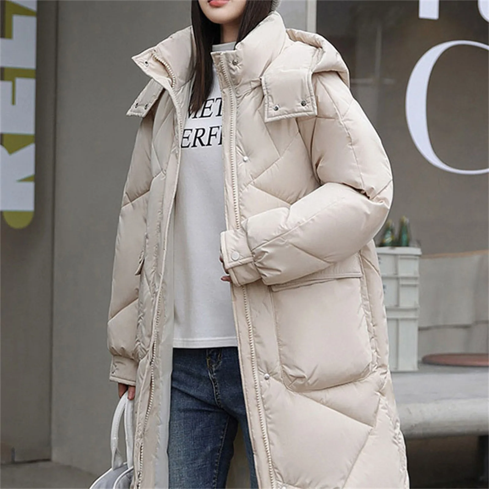 Winter Fashion Solid Color Detachable Hooded Medium Length Over-the-Knee Thickened Down Coat with Double Large Pockets for Women