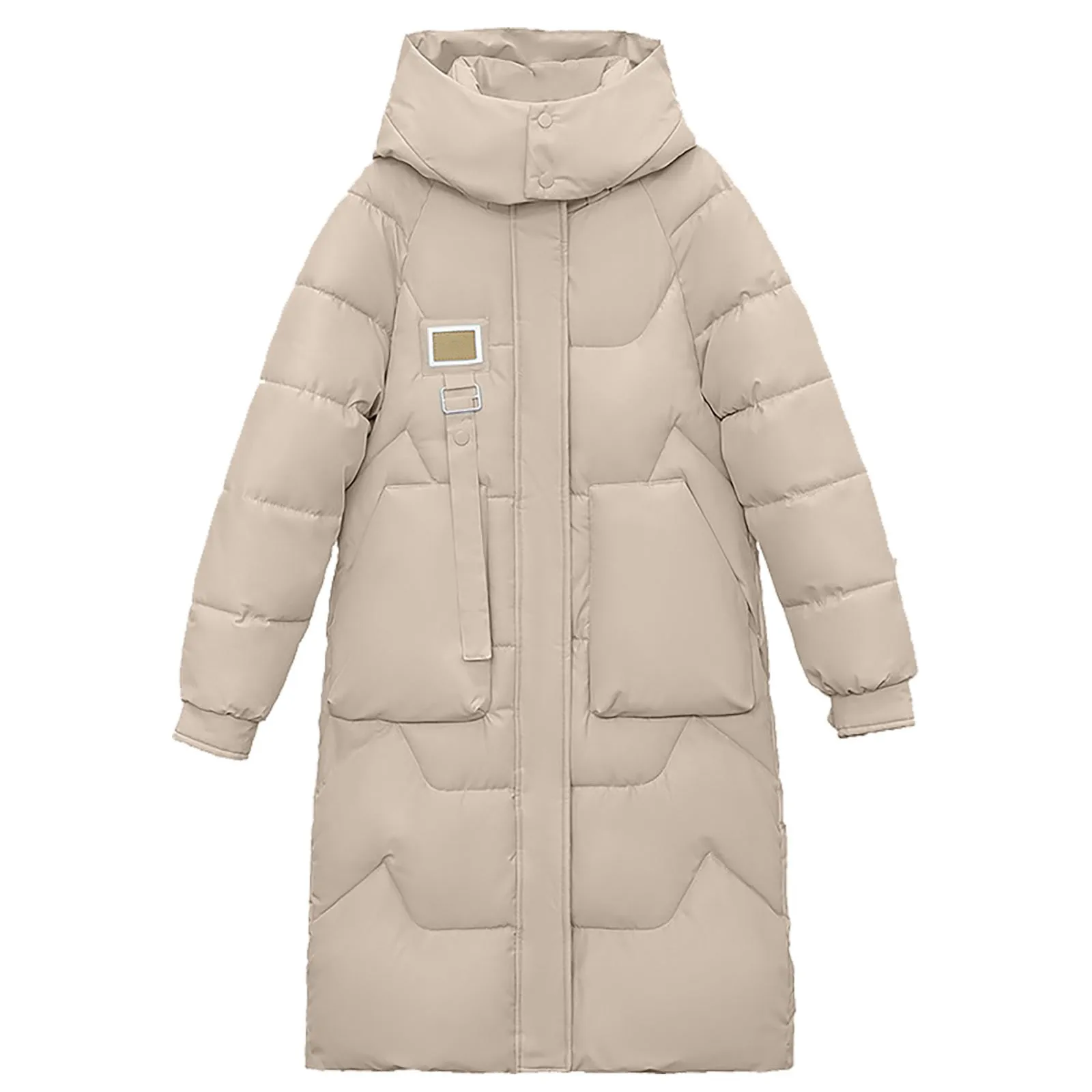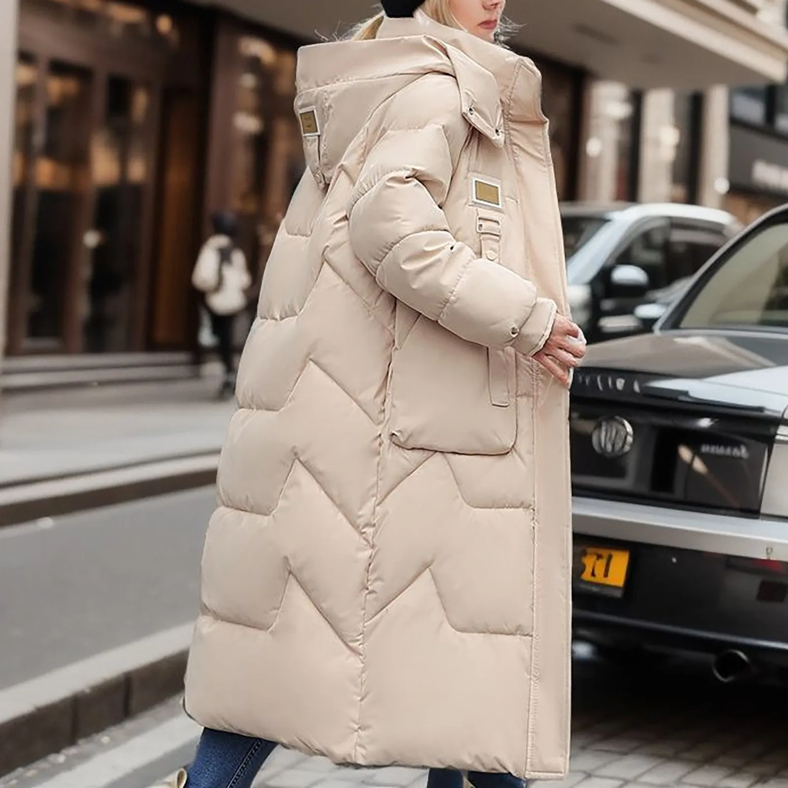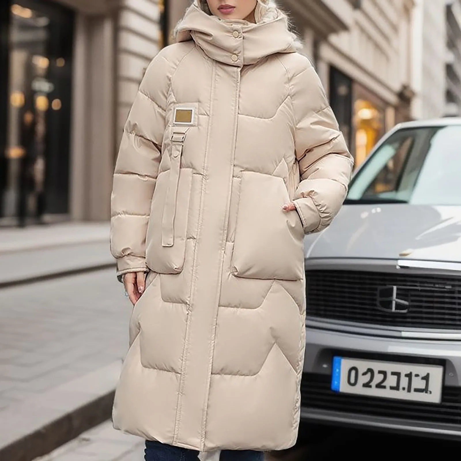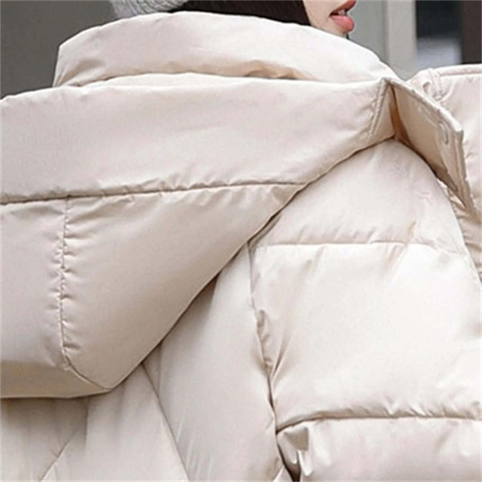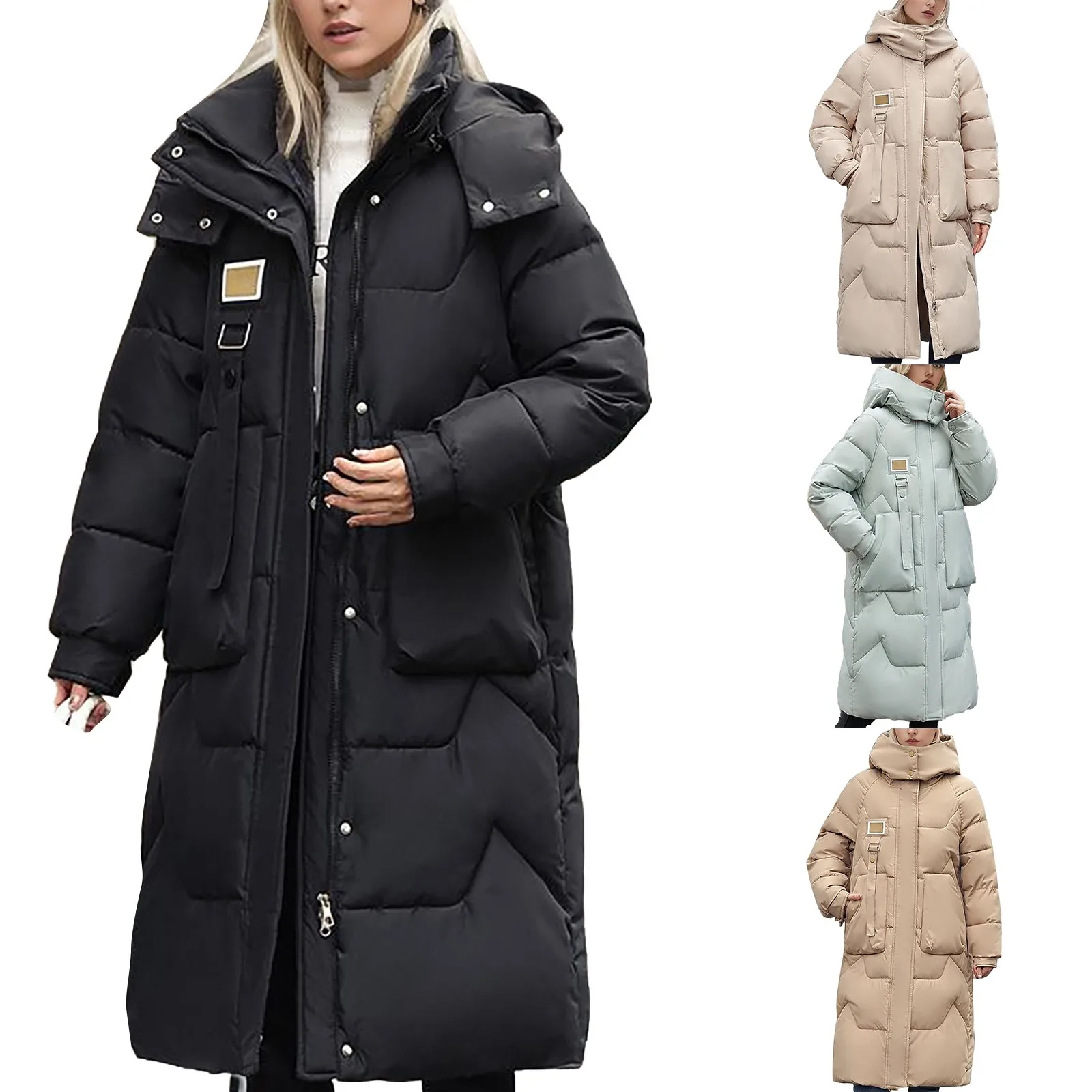 Winter Fashion Solid Color Detachable Hooded Medium Length Over-the-Knee Thickened Down Coat with Double Large Pockets for Women