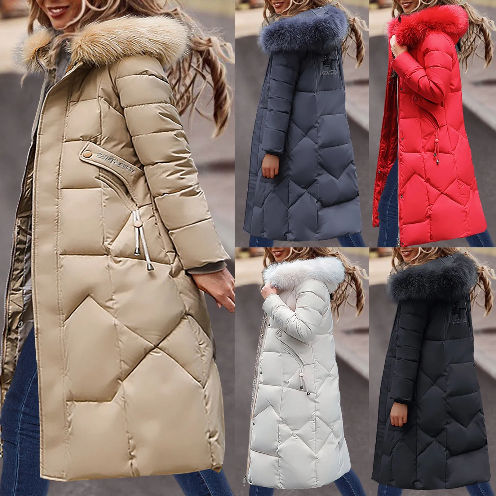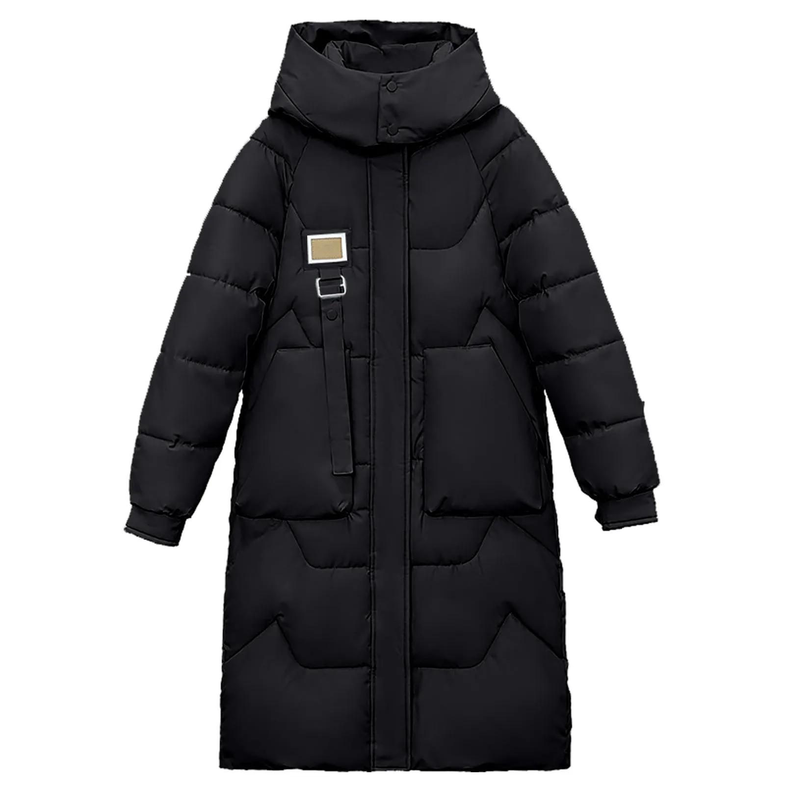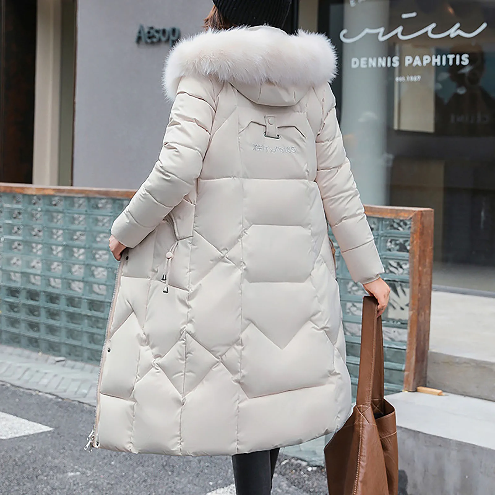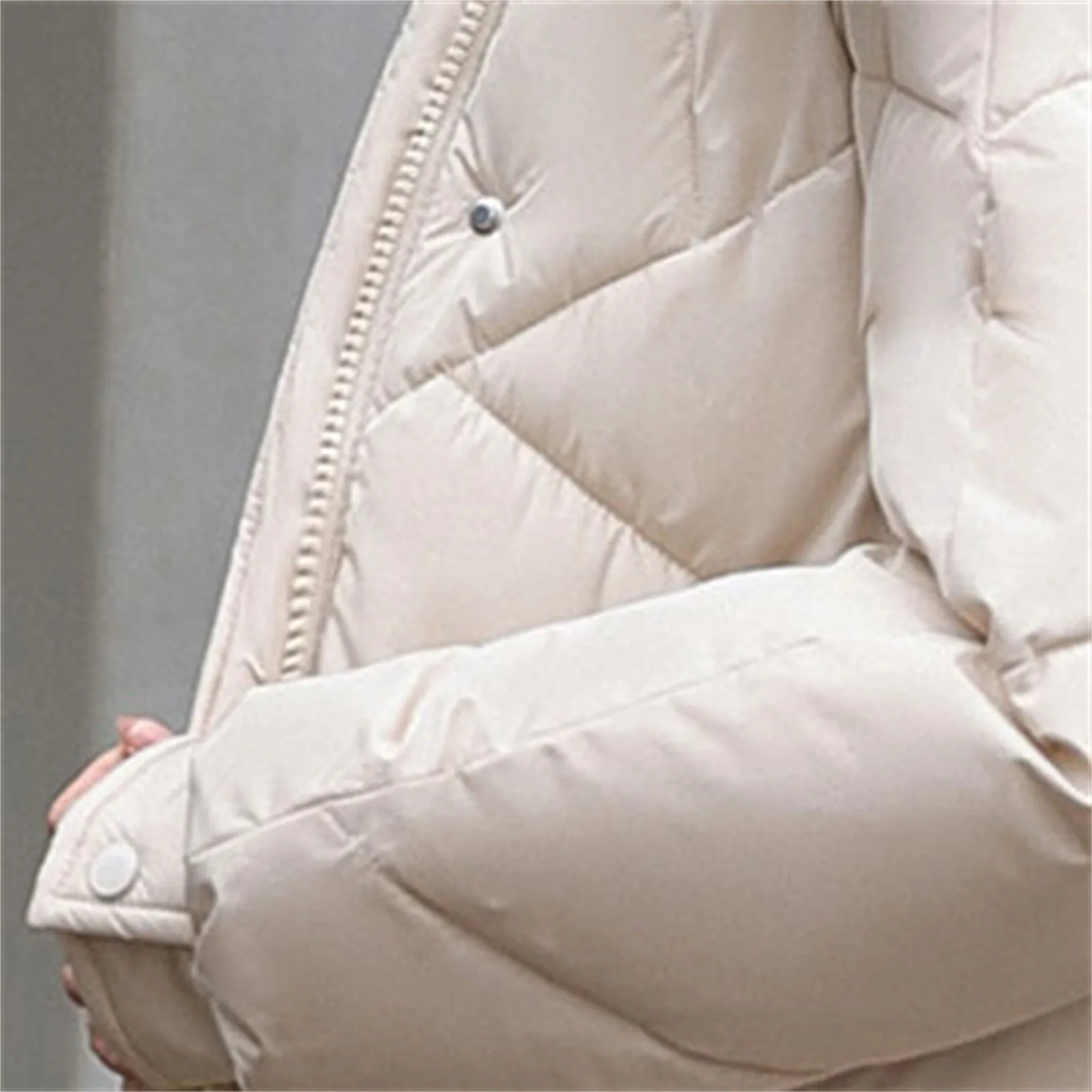 Winter Fashion Solid Color Detachable Hooded Medium Length Over-the-Knee Thickened Down Coat with Double Large Pockets for Women