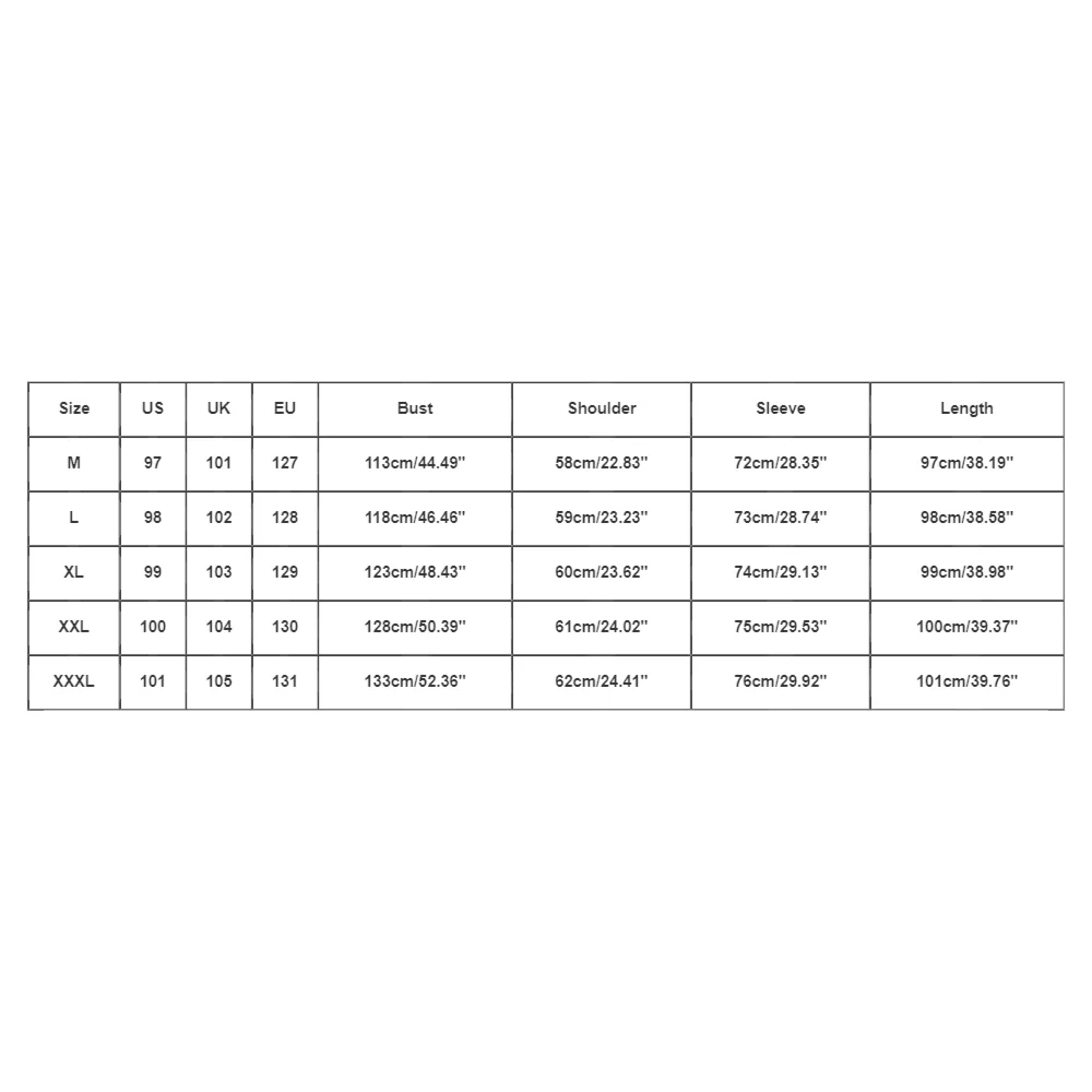 XXL: Bust: 127-135cm (50.00-53.15″), Shoulder: 1cm (0.39″), Sleeve: 76.5cm (30.12″), Length: 106cm (41.73″), Weight: 72-80Kg