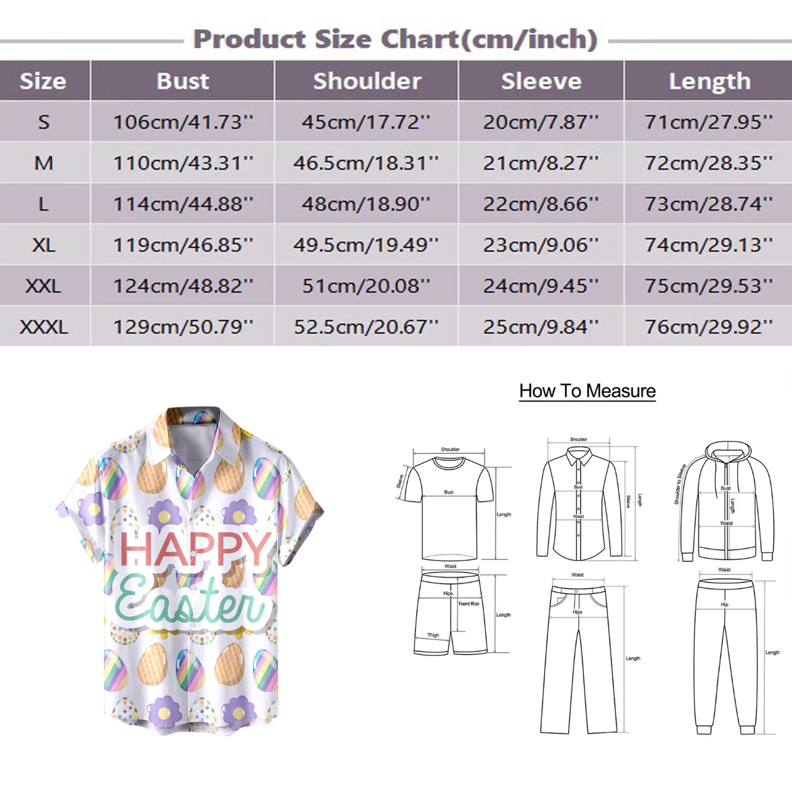 - XXXL: Bust: 129cm/50.79”, Shoulder: 52.5cm/20.67”, Sleeve: 25cm/9.84”, Length: 76cm/29.92”