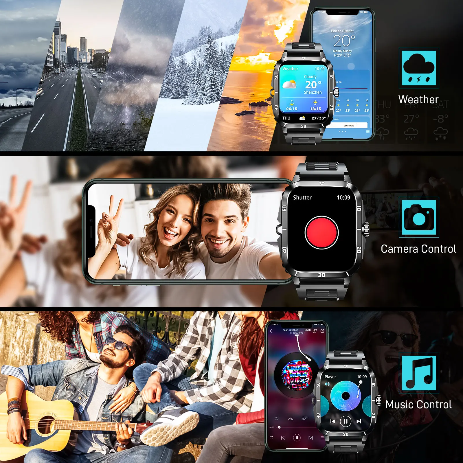 - Intelligent voice assistant, music control, music, remote camera, weather forecast, stopwatch, calculator, do not disturb mode, power saving mode