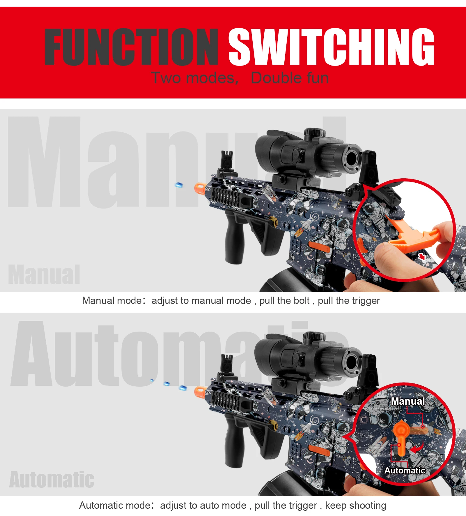 - Dynamic Dual-Mode Firing: Command the game with versatile play! Easily switch between “Electric” automatic firing for continuous, high-volume action and “Manual” mode for strategic, single-shot precision. This dual functionality offers double the fun and adapts to any combat scenario.