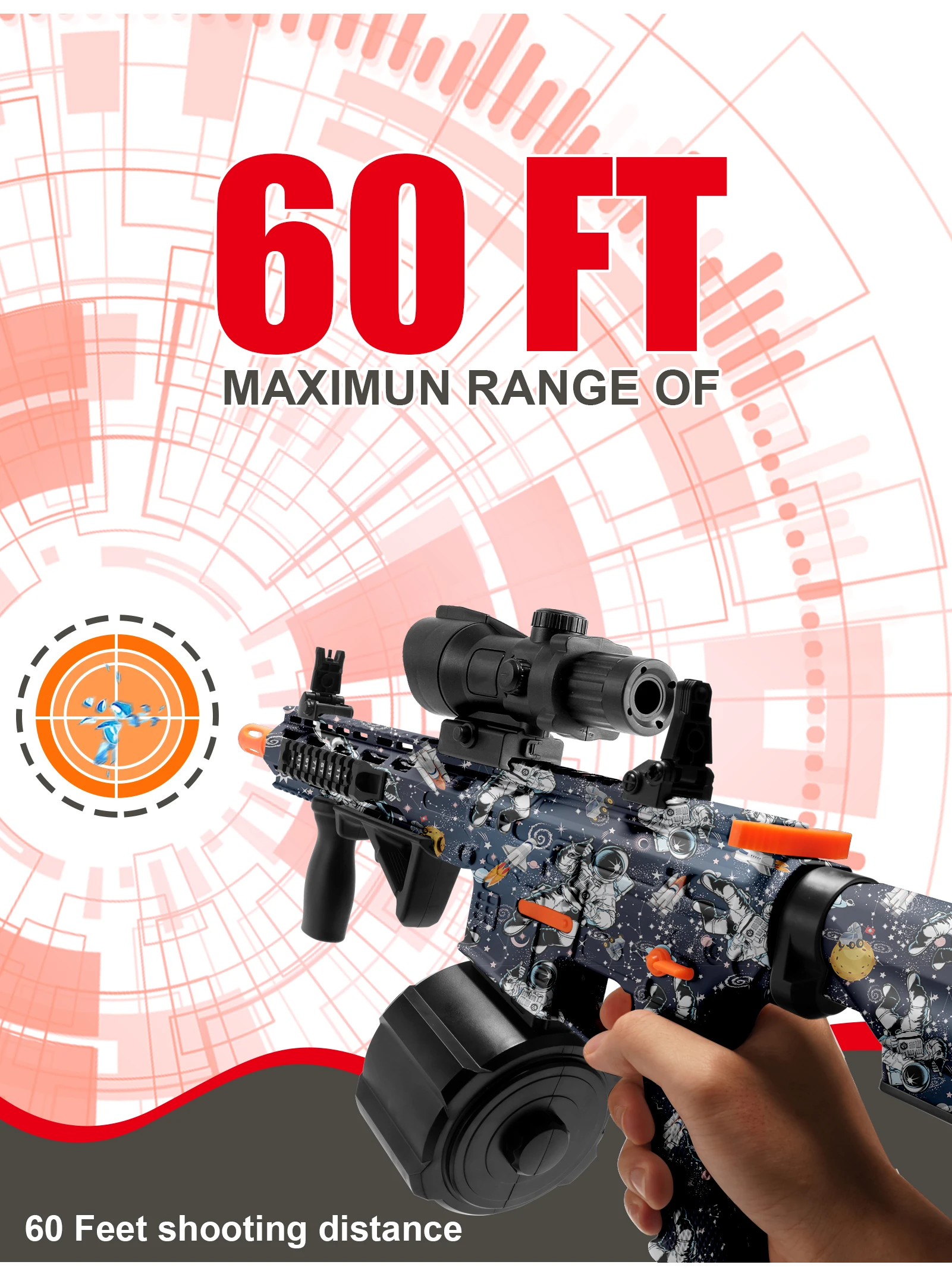 - Extended 60-Foot Maximum Range: Outmaneuver your opponents and hit targets from afar! Our M416 gel blaster boasts an impressive maximum shooting distance of 60 feet, ensuring your gel beads reach their mark with accuracy and power.