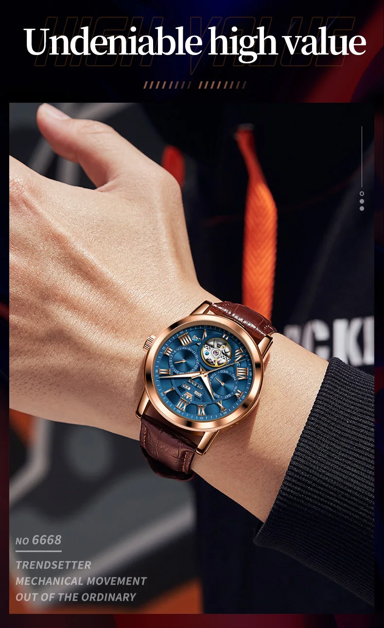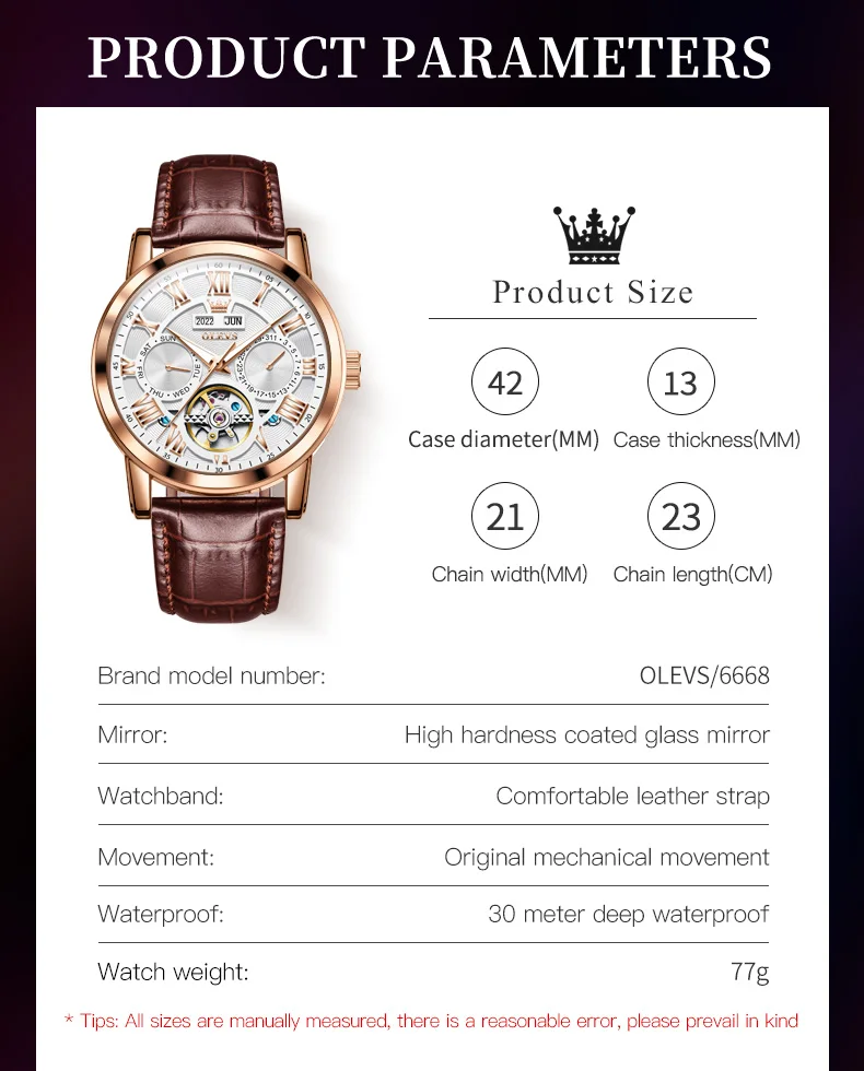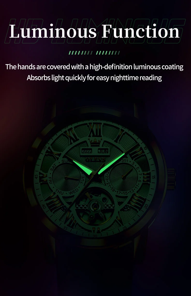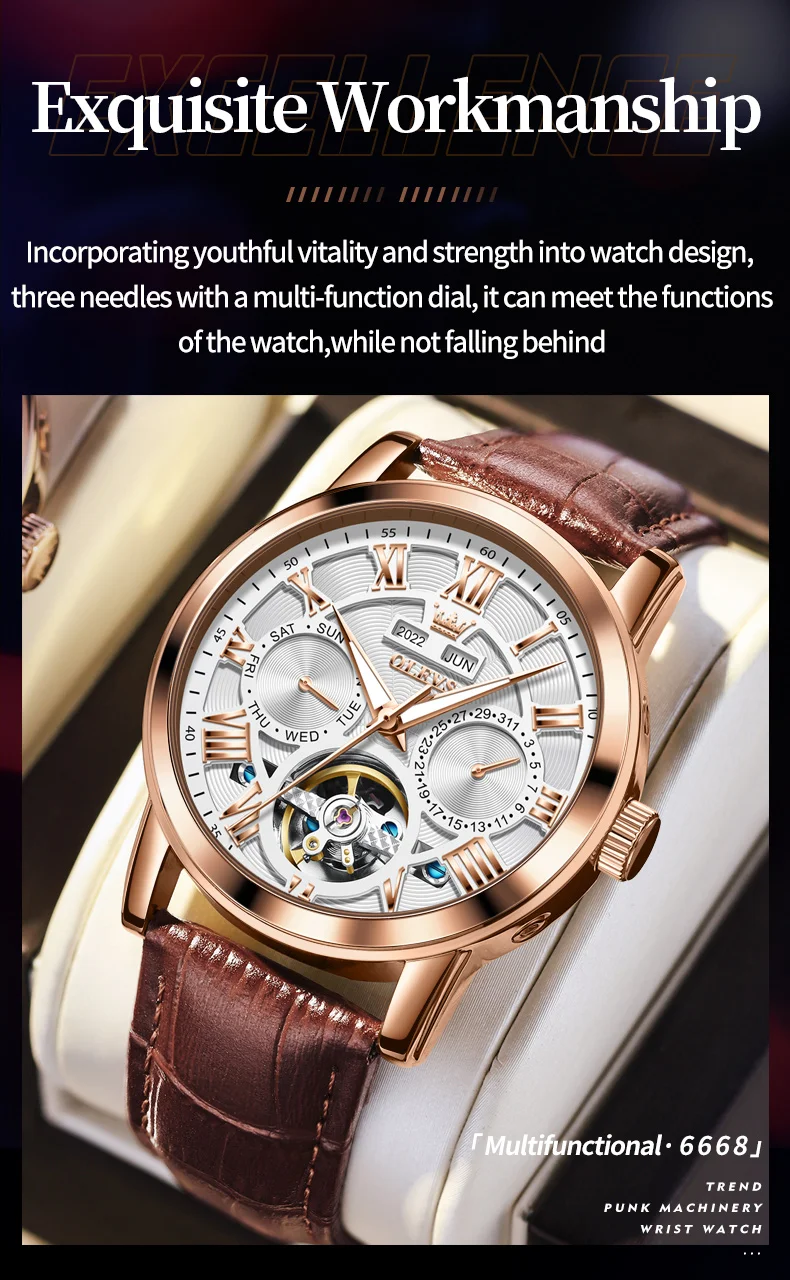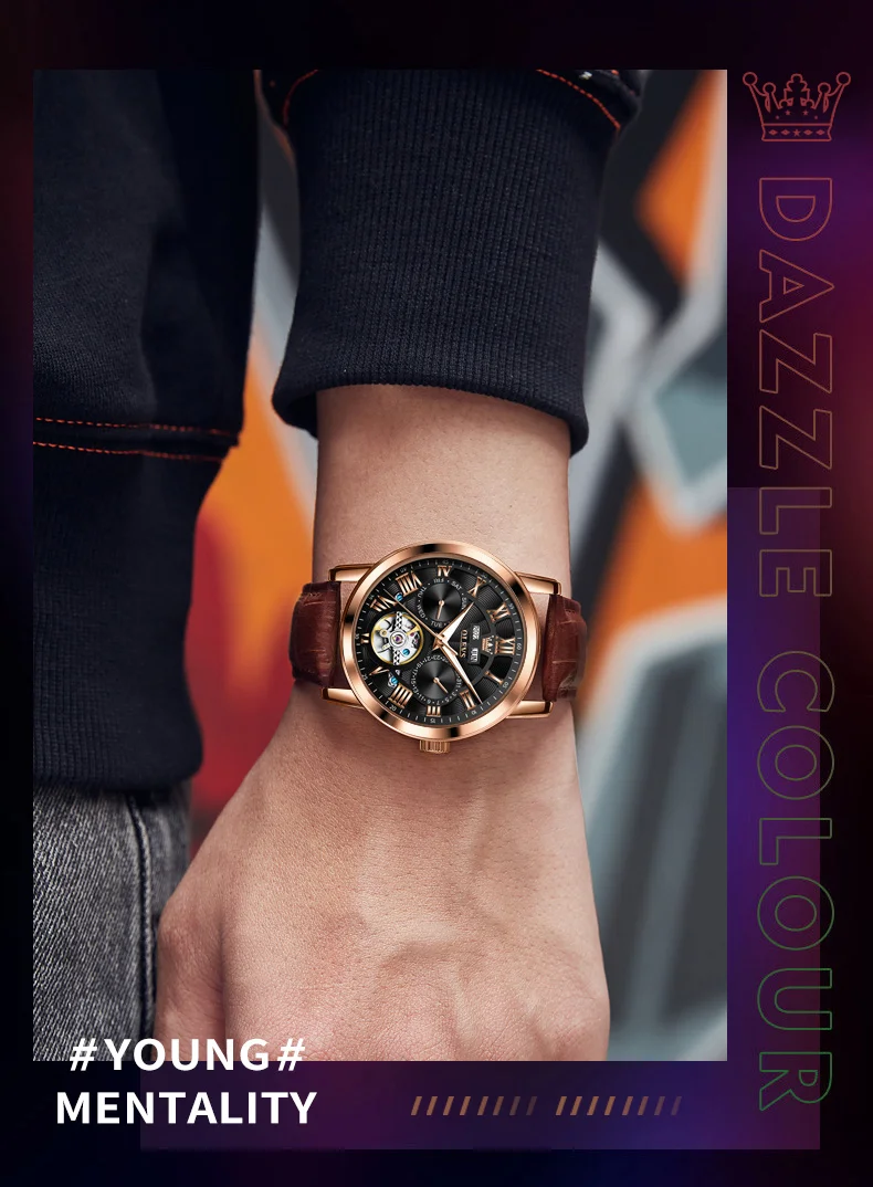 Elevate your wristwear with this automatic watch that combines functionality with aesthetic appeal. The OLEVS Mechanical Watch is not just an accessory; it’s an investment in quality, style, and precision, making it a must-have for those who value the essence of time and the beauty of mechanical innovation.