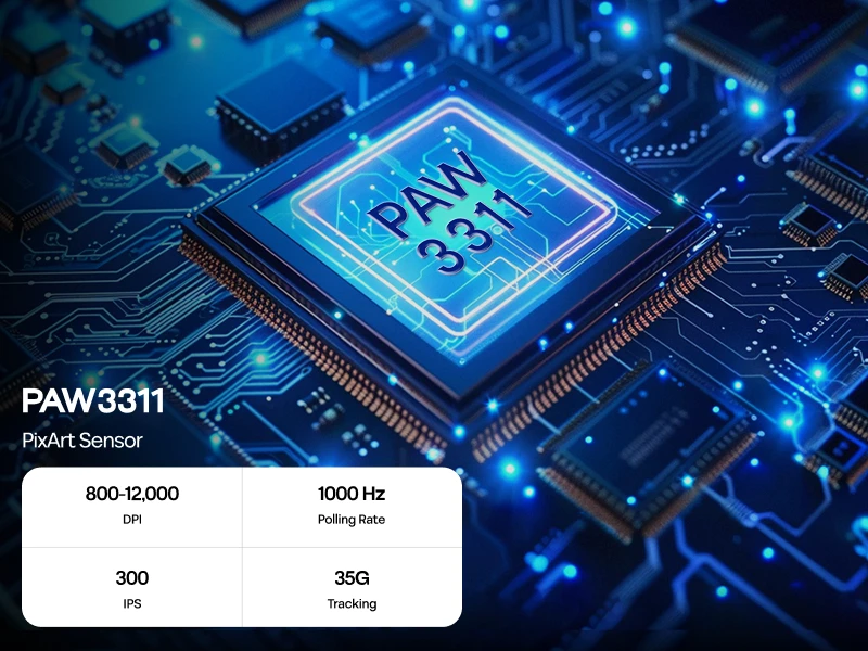 The PAW3311 sensor supports adjustable DPI from 800 to 24000 with a 1000Hz polling rate in 2.4G or USB mode. It is listed with 300 IPS tracking speed, 35G acceleration, and 1ms latency for responsive movement and steady aim.