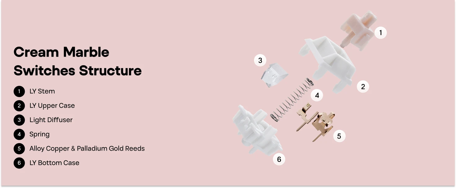 With a light, balanced press, the Cream Marble Switch hits a sweet spot between easy movement and satisfying stability. It is a great fit for marathon typing, rapid inputs, and competitive gaming where consistency matters.