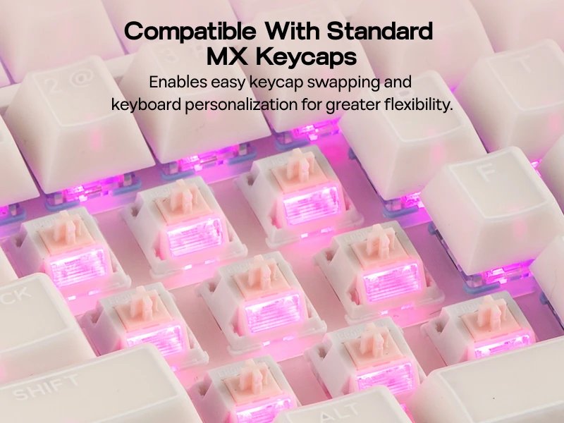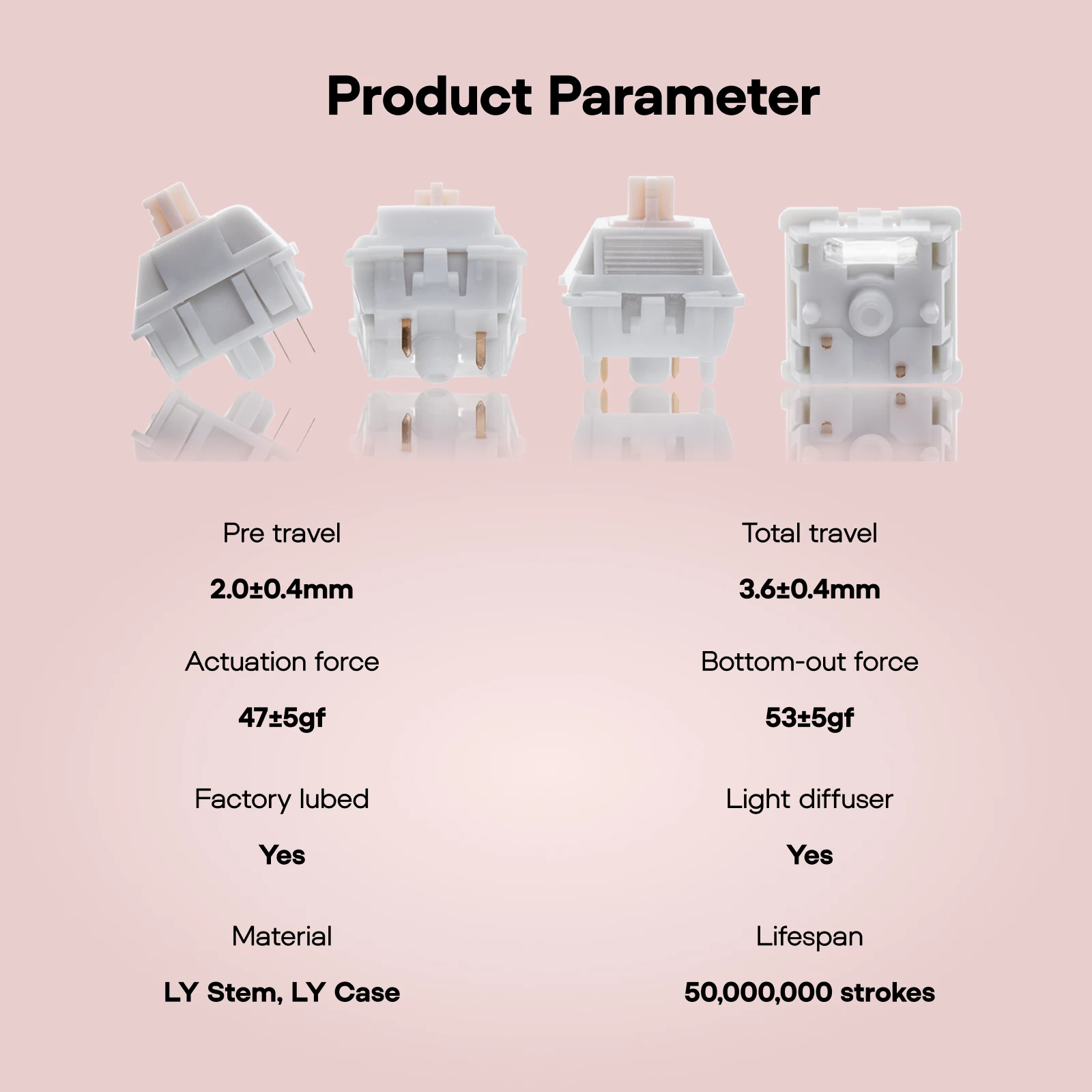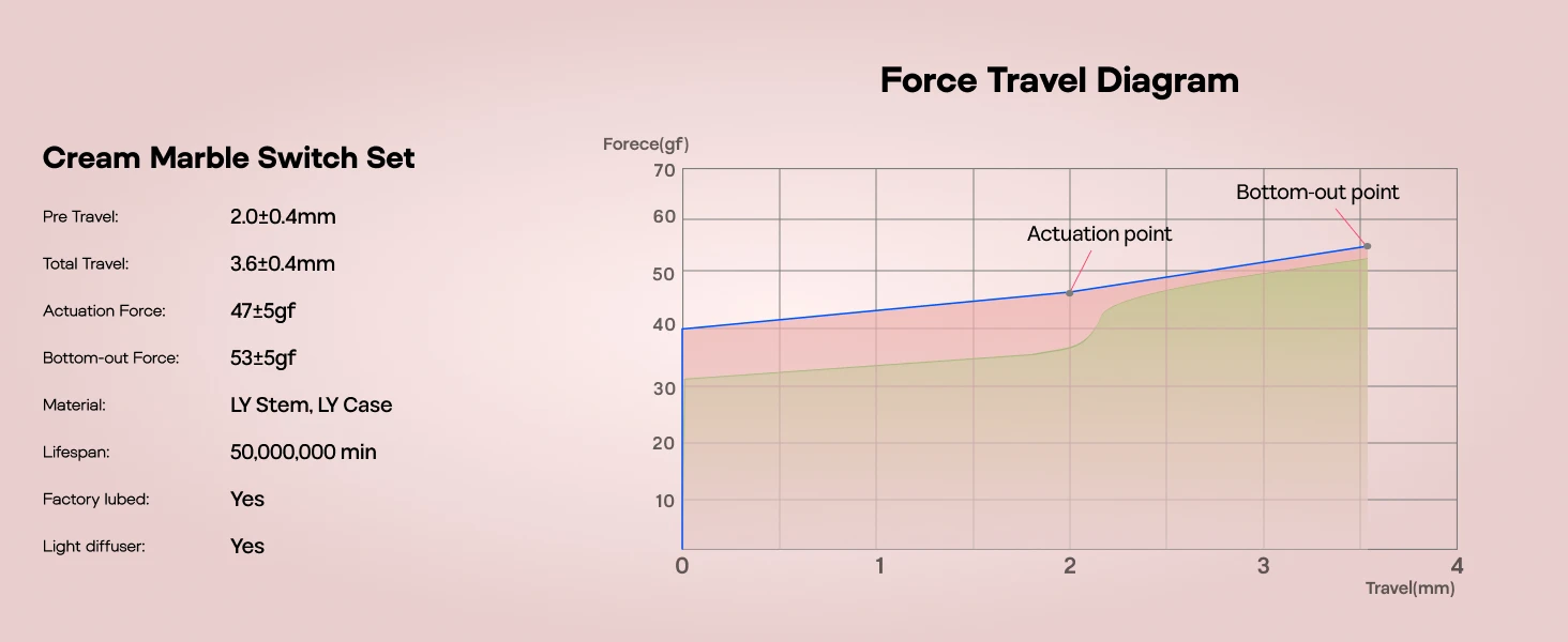 Rated for 50 million keystrokes, these switches are built for reliable daily use. Travel is tuned for consistent actuation and steady feel, from casual typing to serious play.