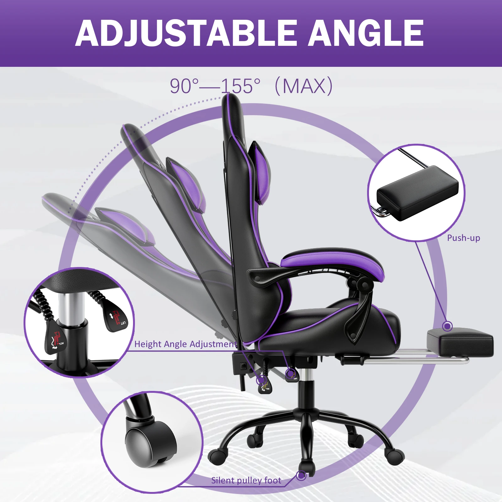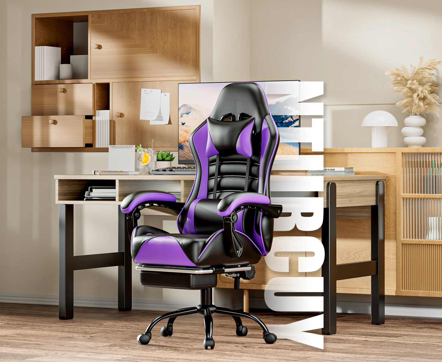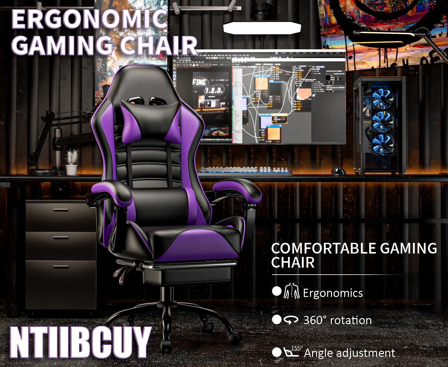 Ergonomic Computer Gaming Chair: Following the curve of the human spine, this racing-style chair is designed with an ergonomic structure to support your neck and relax your lower back. The removable lumbar cushion and neck pillow keep you comfortable while gaming and the retractable footrest enhances your sitting experience.