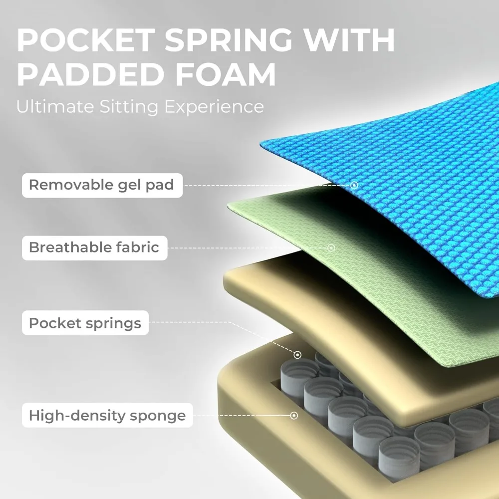 - Individual Pocket Springs: The seat cushion is composed of pocket springs, a type of spring commonly used in sofas. Each spring operates independently, offering elasticity and support by adapting to pressure and contouring to your body’s weight, providing a luxurious and comfortable experience akin to that of a sofa.