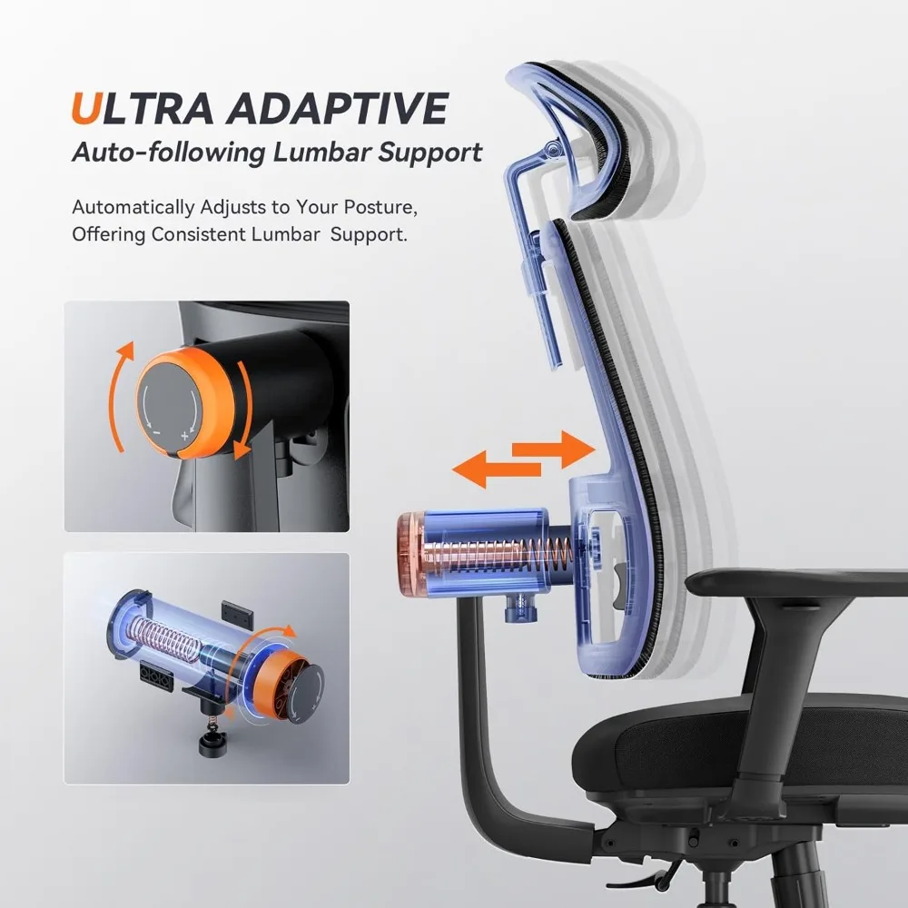 - Ergonomic Lockable Auto-following Lumbar Support: Office chair uses innovative automatic lumbar tracking technology to automatically follow the movement of your lumbar spine, providing strong support for your lower back throughout the day. Lumbar support strength can be adjusted according to your needs. It fits the natural curvature of your spine and helps relieve back pain caused by sitting for too long.