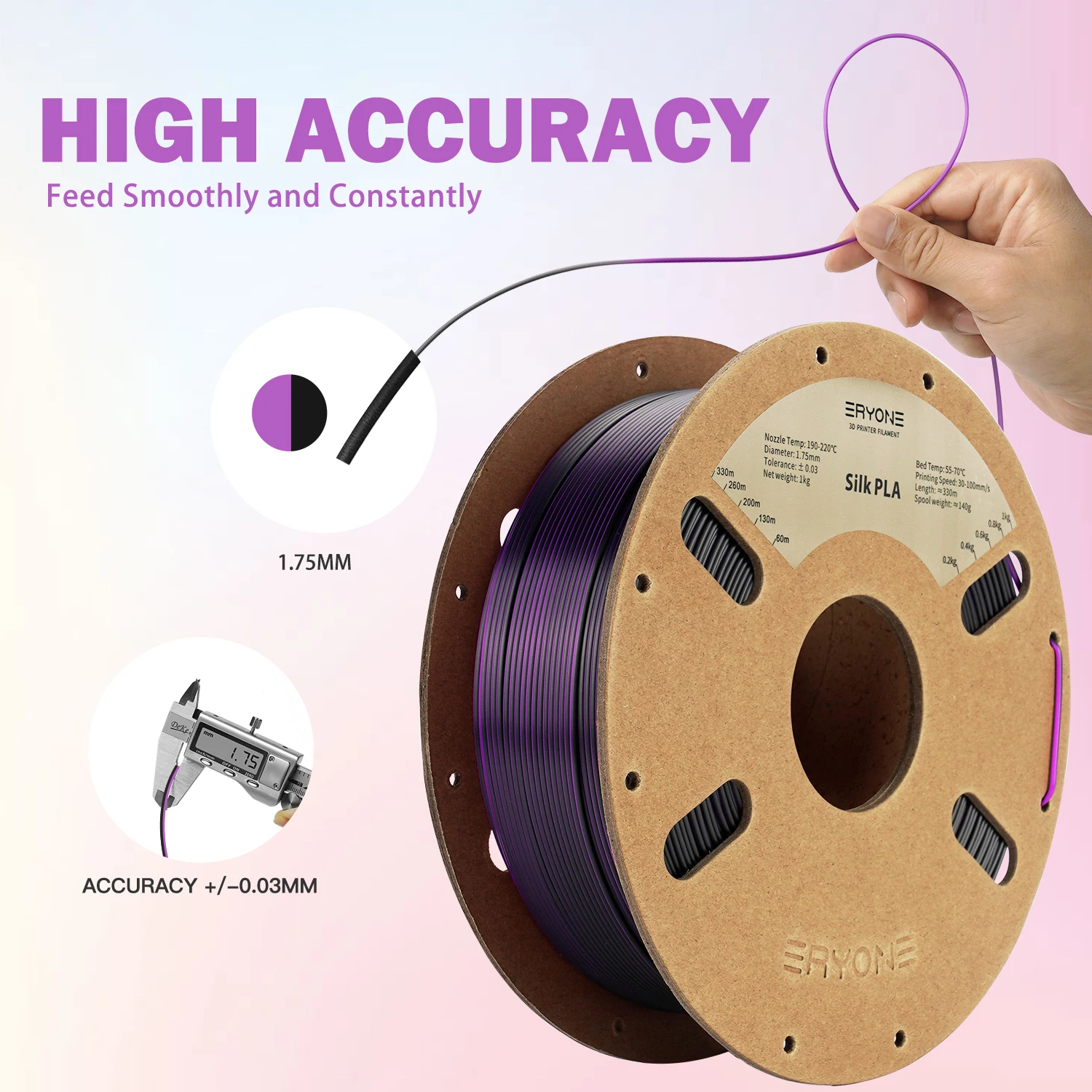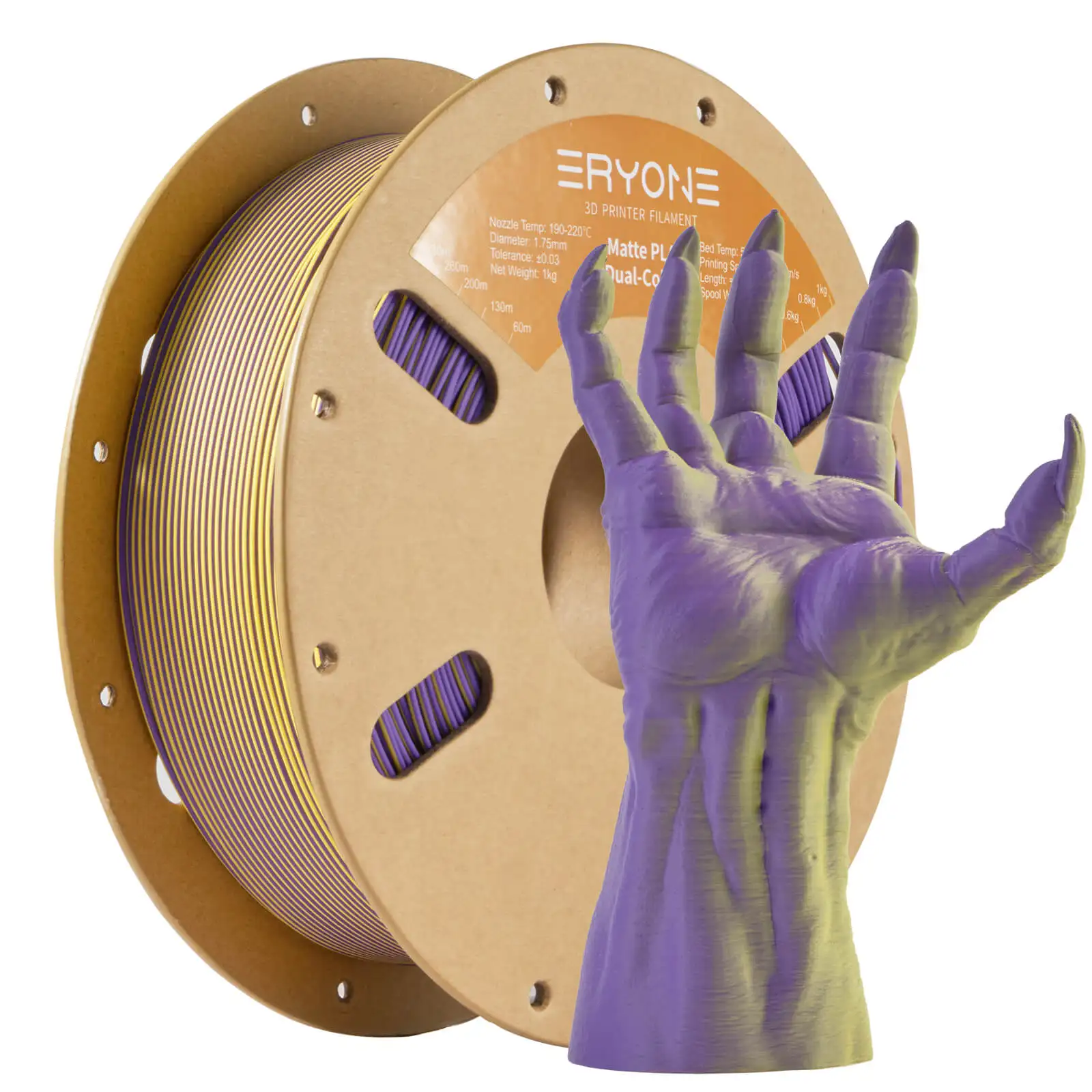 Unleash a new dimension of creativity with ERYONE Silk Dual Color PLA Filament, now featuring an innovative and sustainable cardboard spool! Our “Same Great Filament” has a “New Look,” combining breathtaking visual shifts with reliable printing performance. This filament is meticulously engineered to bring your 3D printing projects to life with captivating color transitions and a luxurious silk sheen, making every print a unique masterpiece.