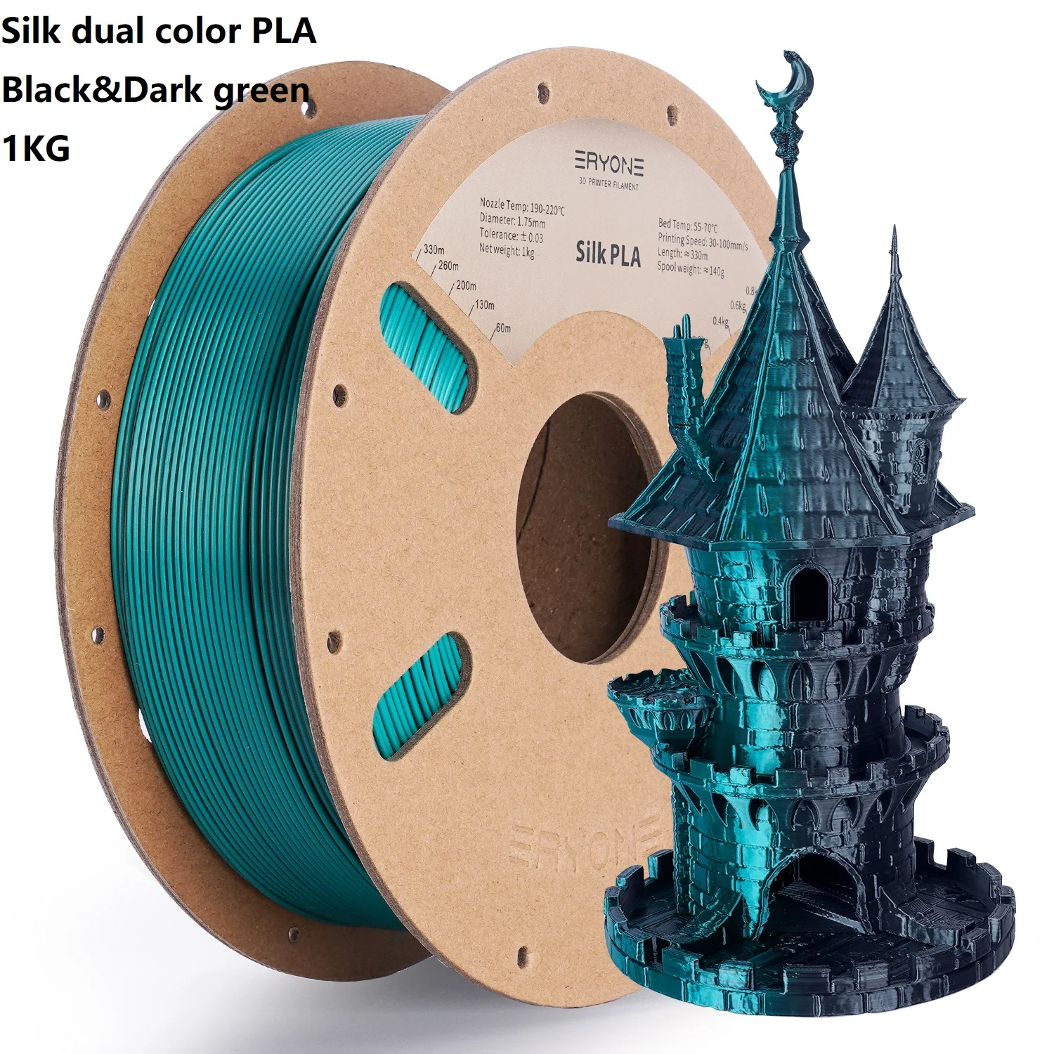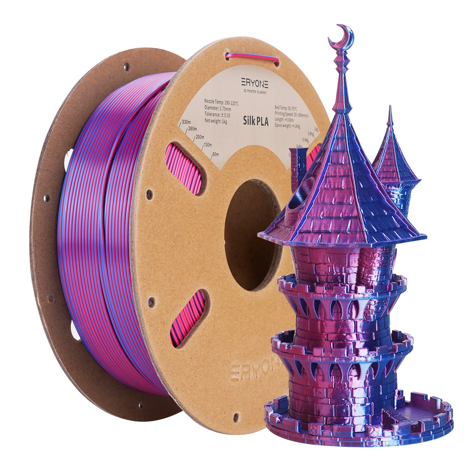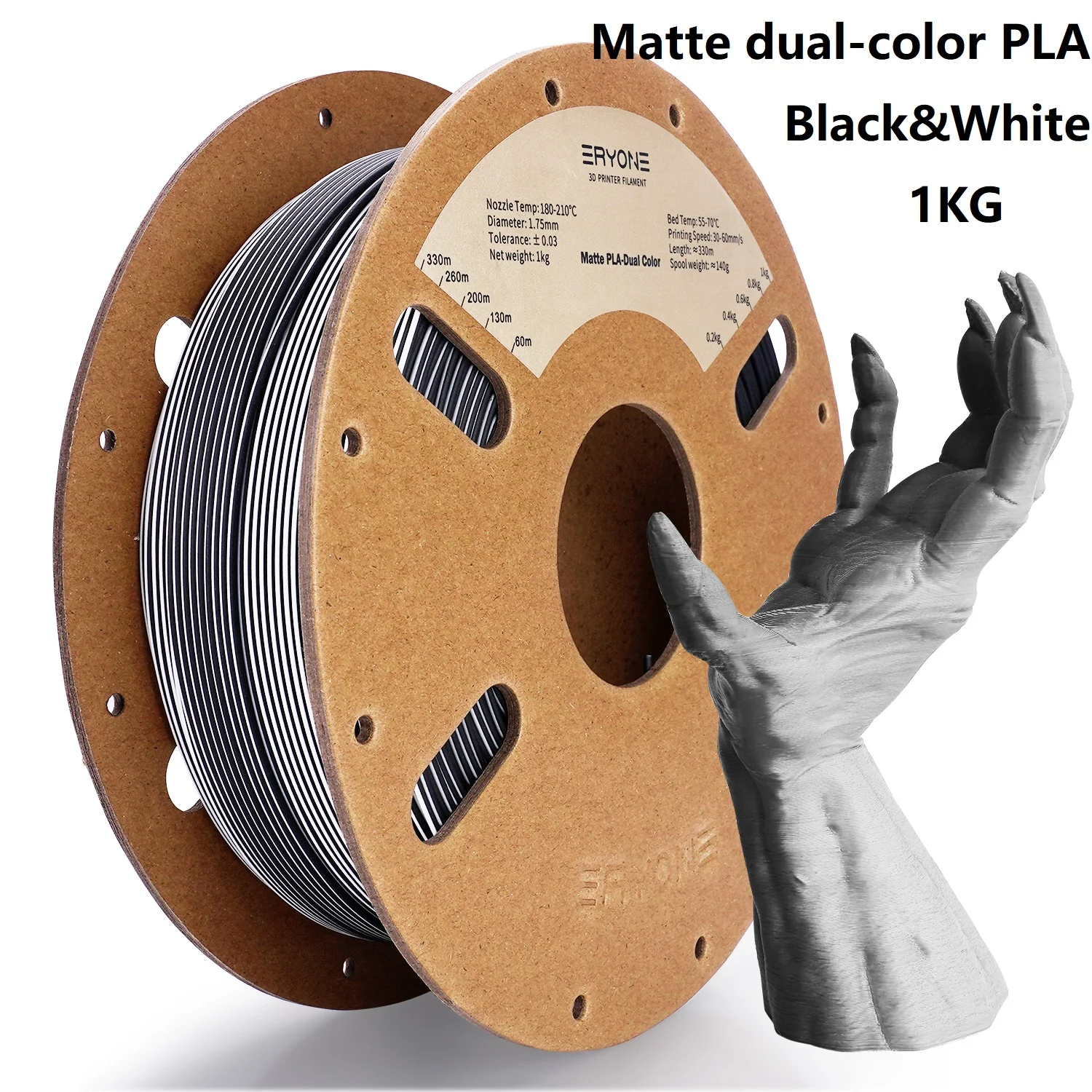 With a net weight of 1 kg and approximately 330m of filament per spool, ERYONE Silk Dual Color PLA provides ample material for numerous projects. Elevate your 3D printing game and start “Bringing Ideas to Your Life!” with the unparalleled beauty and reliability of ERYONE’s innovative dual-color filament.