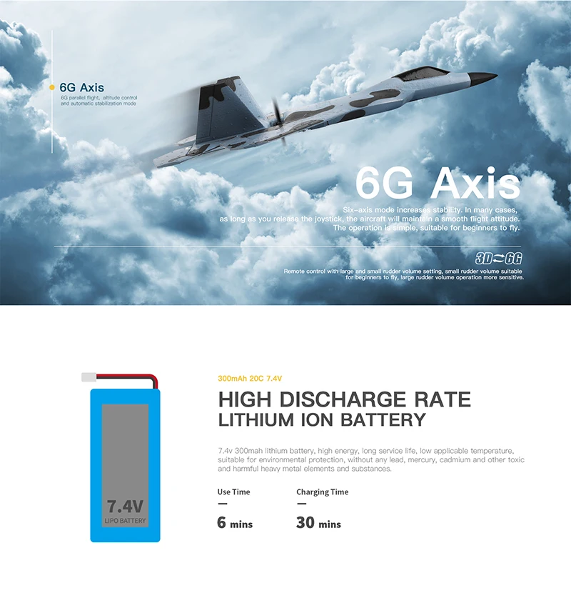 - High-efficiency brushless motor delivers full power. The 3D6G system ensures stability with a reasonable aerodynamic layout, making flight very stable. Beginners can easily fly in 6G mode.