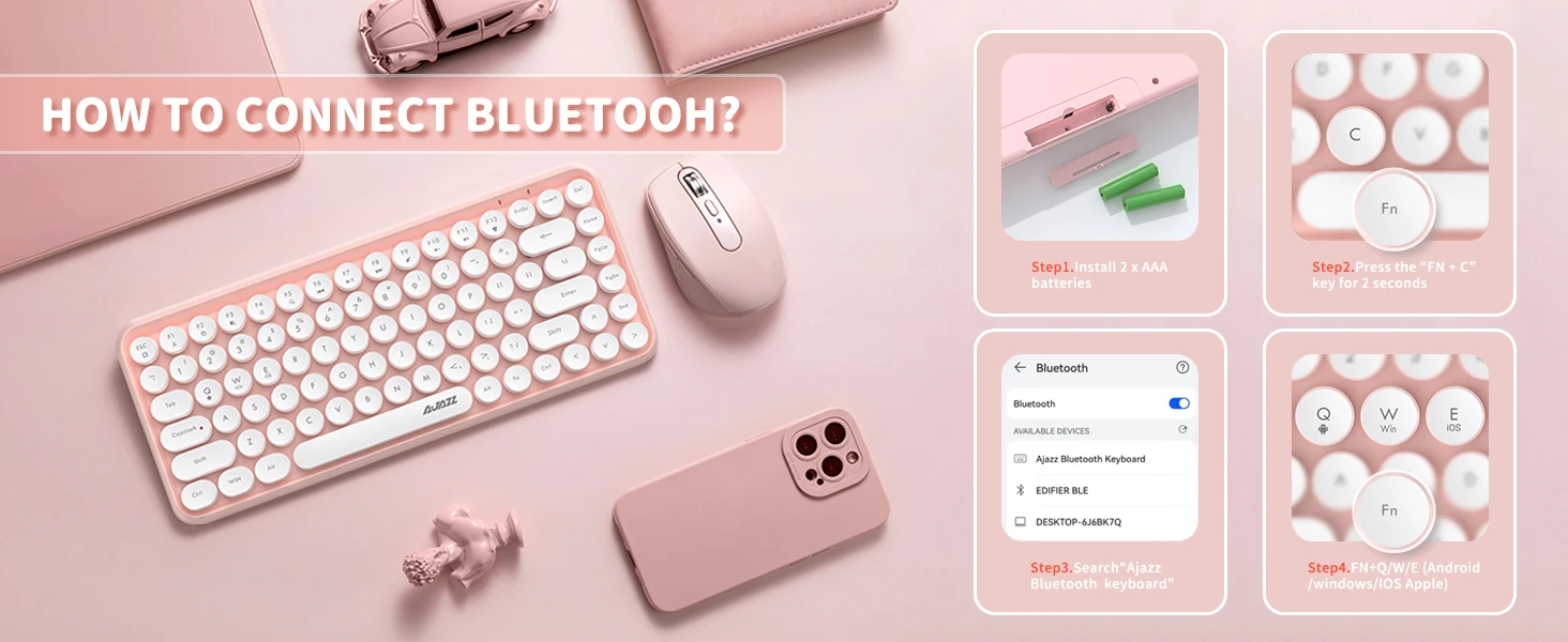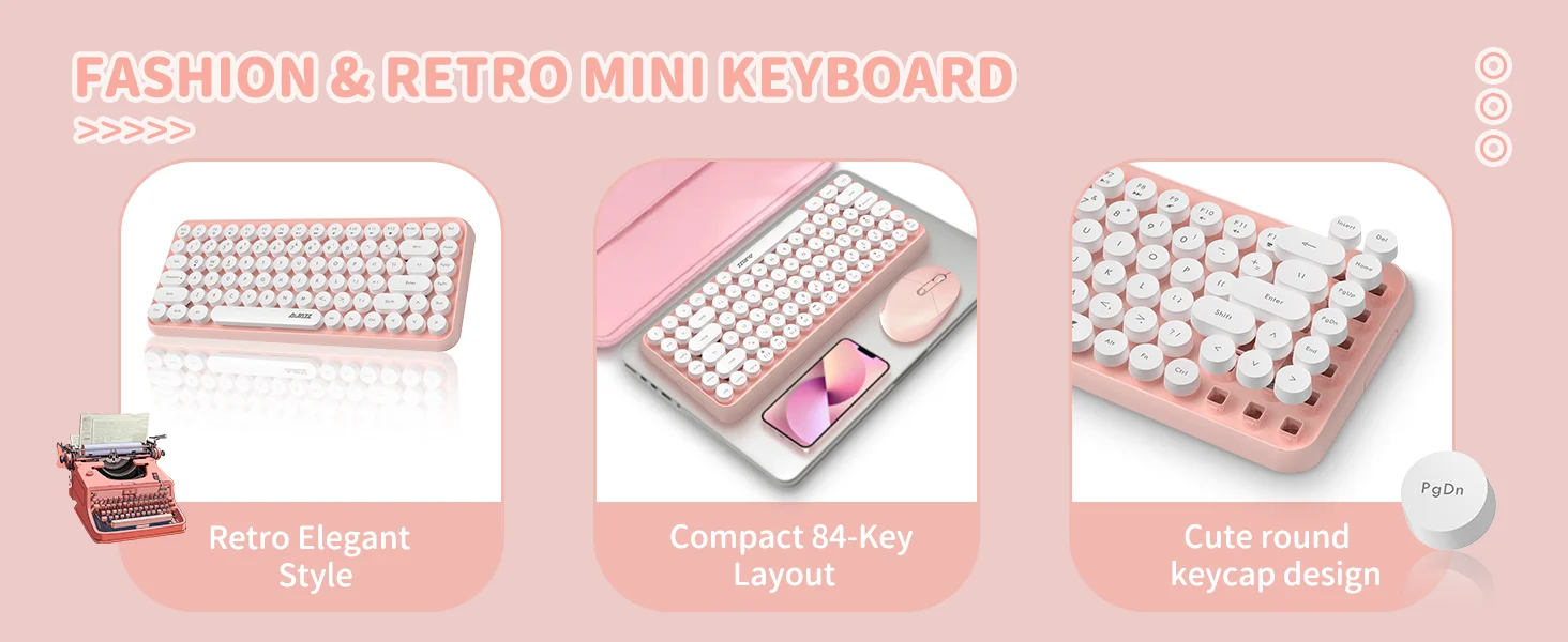 Compact and stylish: This Bluetooth keyboard features 84 round keys in a compact, easy-to-carry layout inspired by classic typewriters. Press FN + C to enter Bluetooth pairing mode.