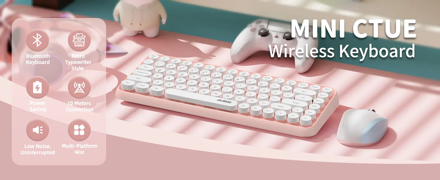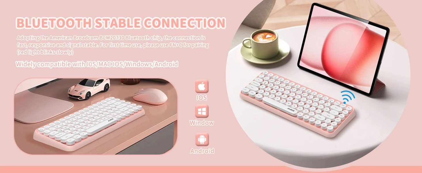 Compact and stylish: This Bluetooth keyboard features 84 round keys in a compact, easy-to-carry layout inspired by classic typewriters. Press FN + C to enter Bluetooth pairing mode.