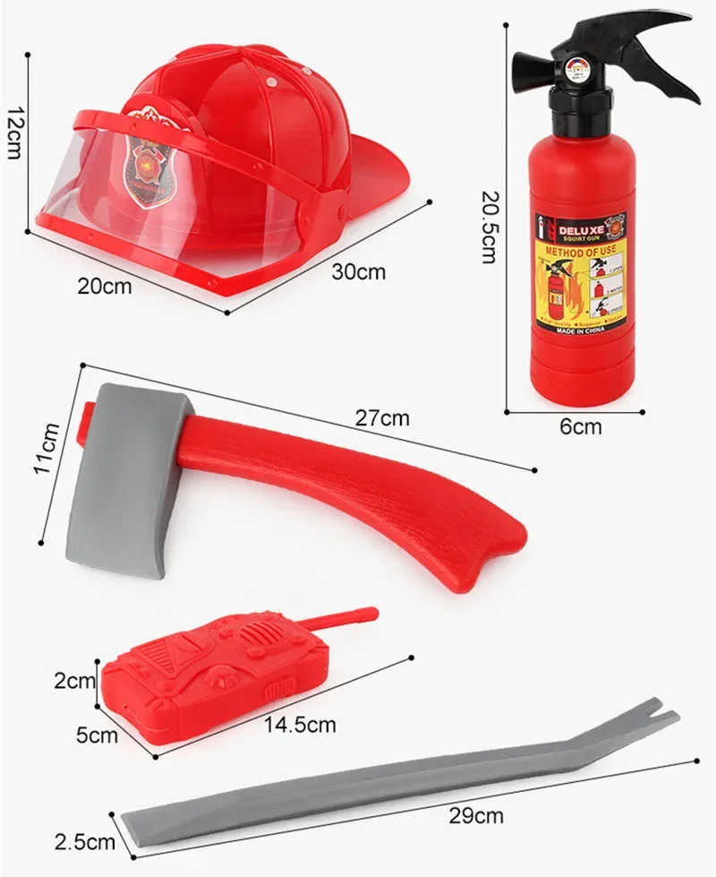 ● Includes an adjustable helmet, mess-free working water extinguisher, axe, whistle, personalized name tag, and fireman knapsack.