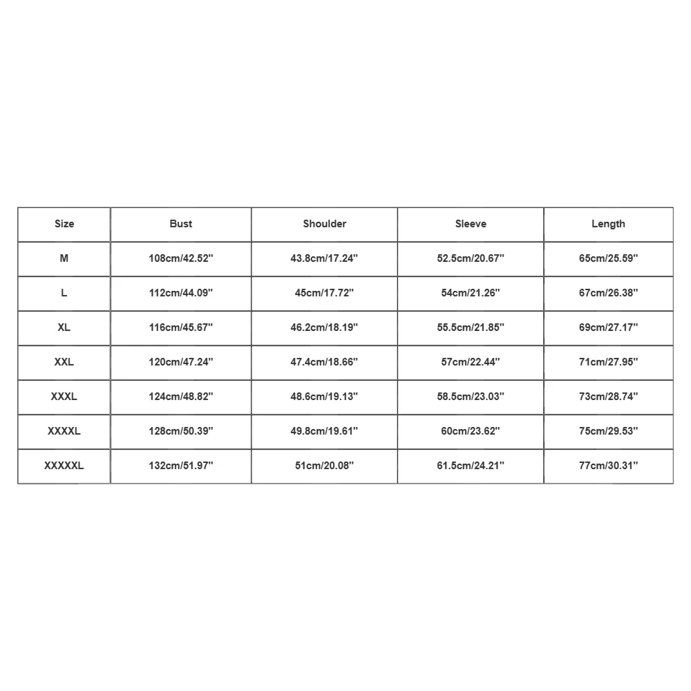 Size XXXXXL: Bust 132cm (51.97”) | Shoulder 51cm (20.08”) | Sleeve 61.5cm (24.21”) | Length 77cm (30.31”)