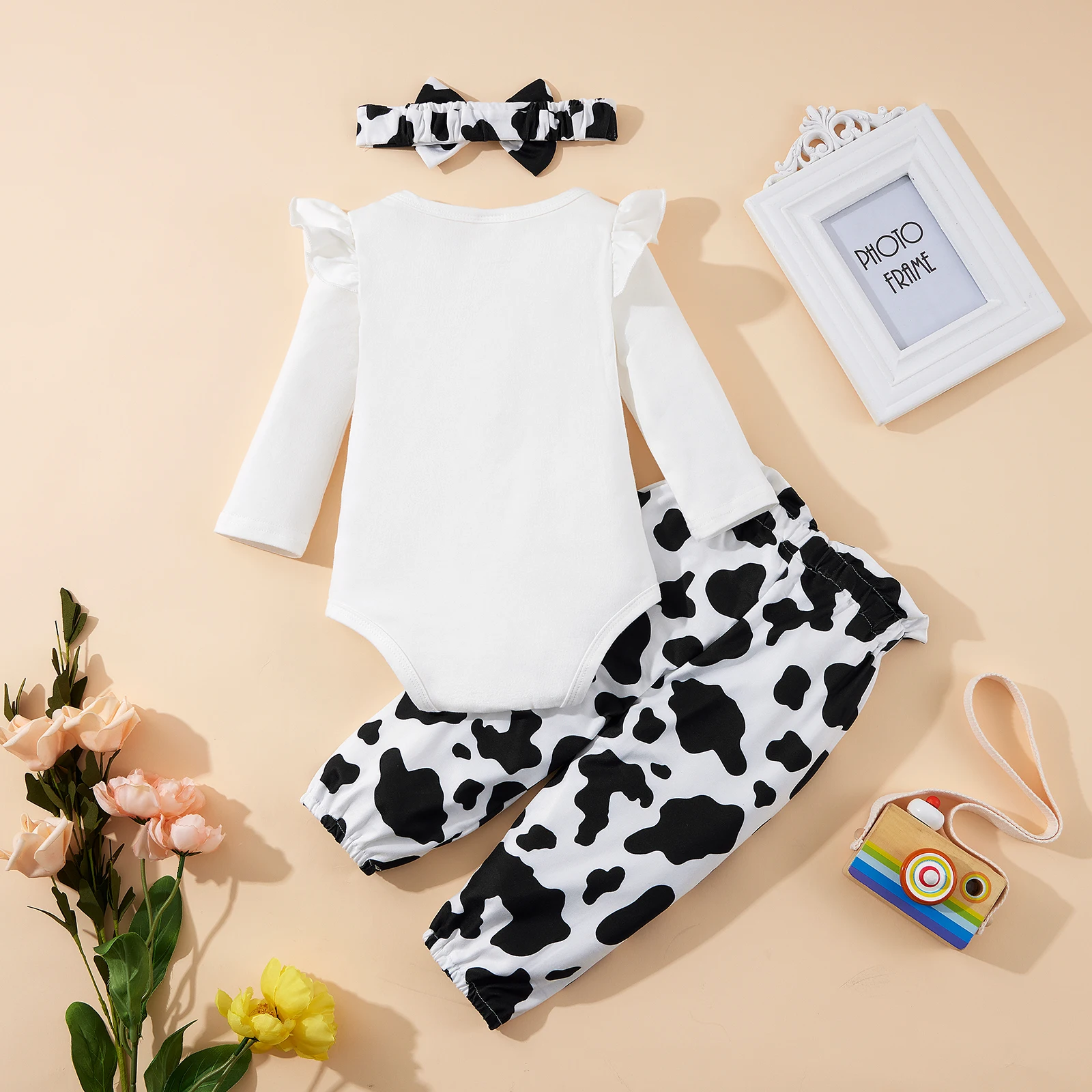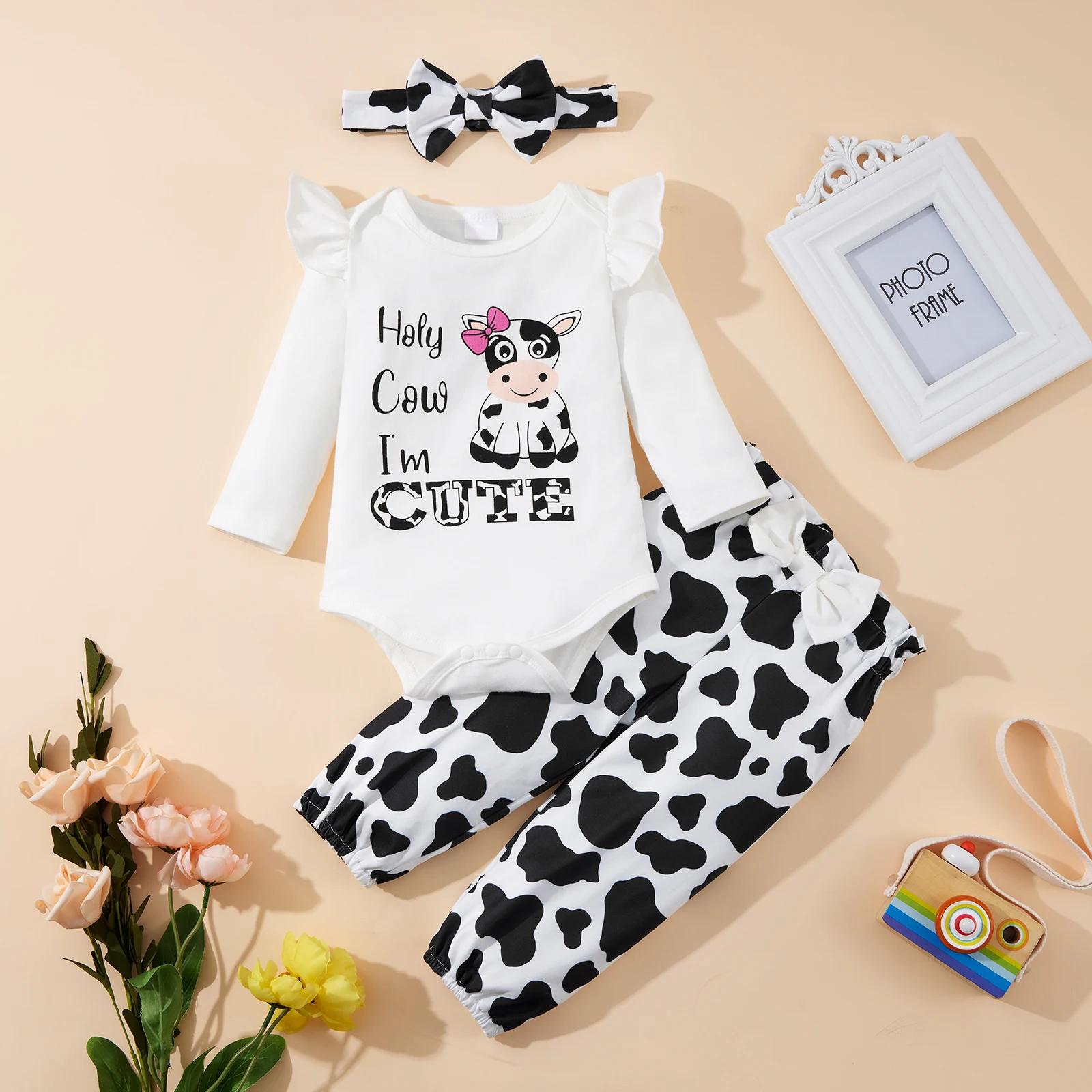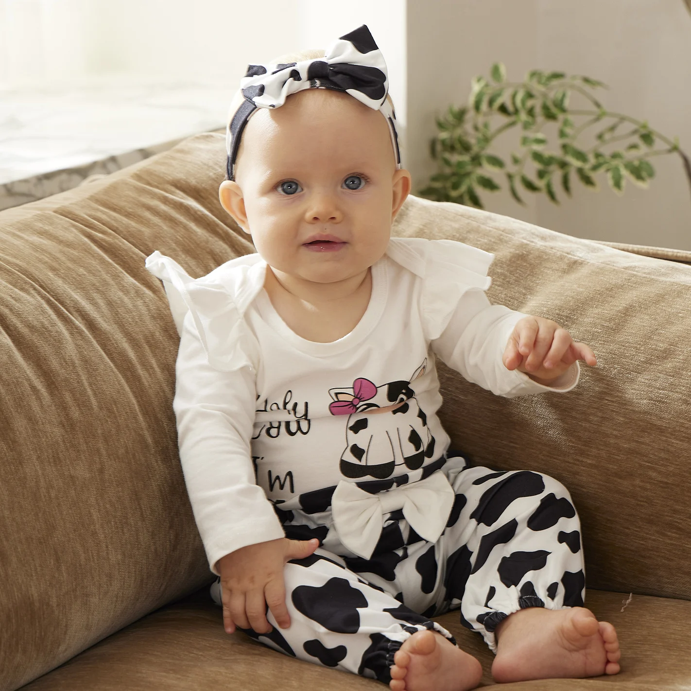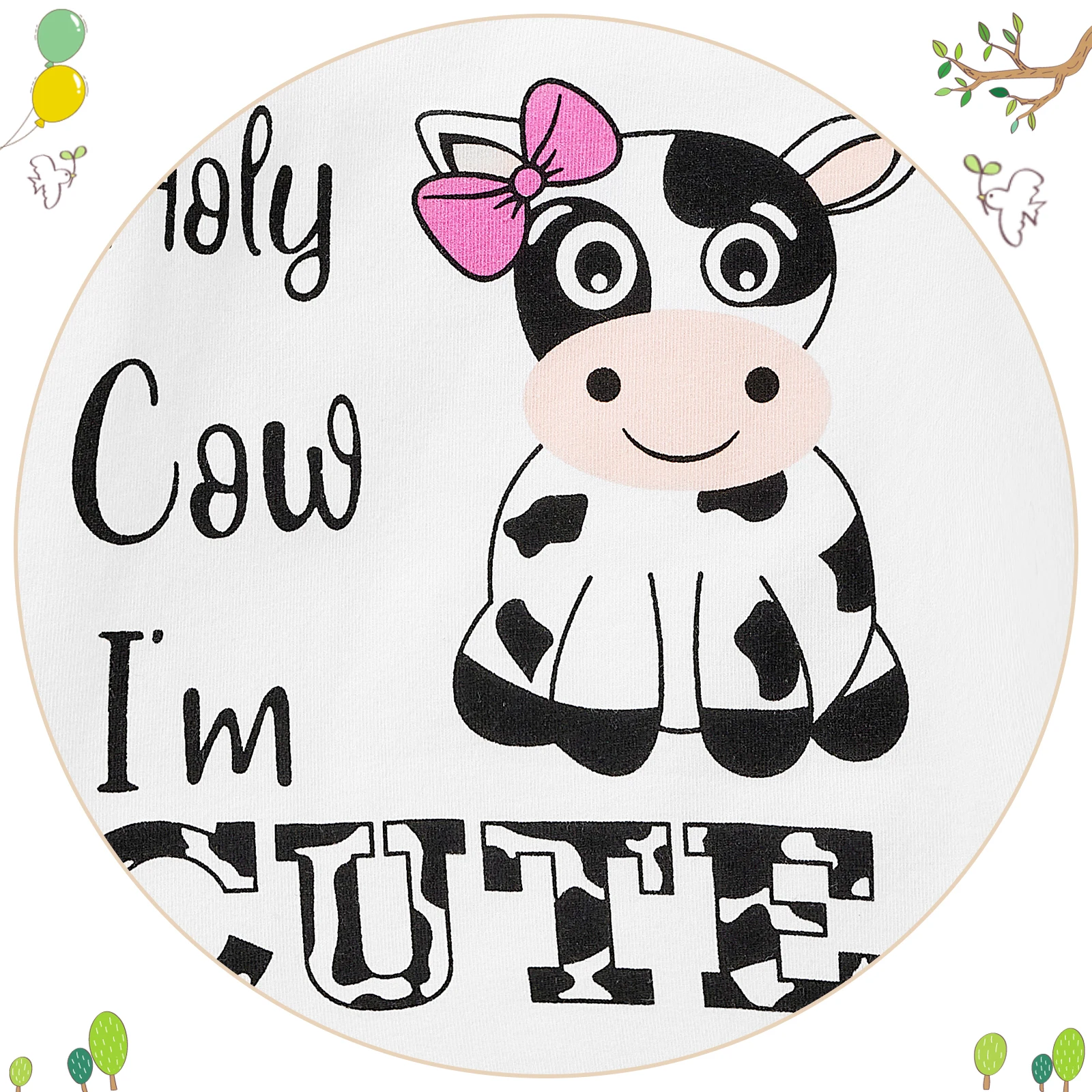 - Letters Print Baby Girl Clothes: Trendy leopard pattern, cow pattern and flowers pattern are designed to make baby girls in the long sleeve outfits look very lovely. Available letters print: “Isn’t she lovely”, “Daddy’s little girl”, “Holy Cow I’m Cute”, “Auntie is my bestie”, “Mommy’s little girl”.