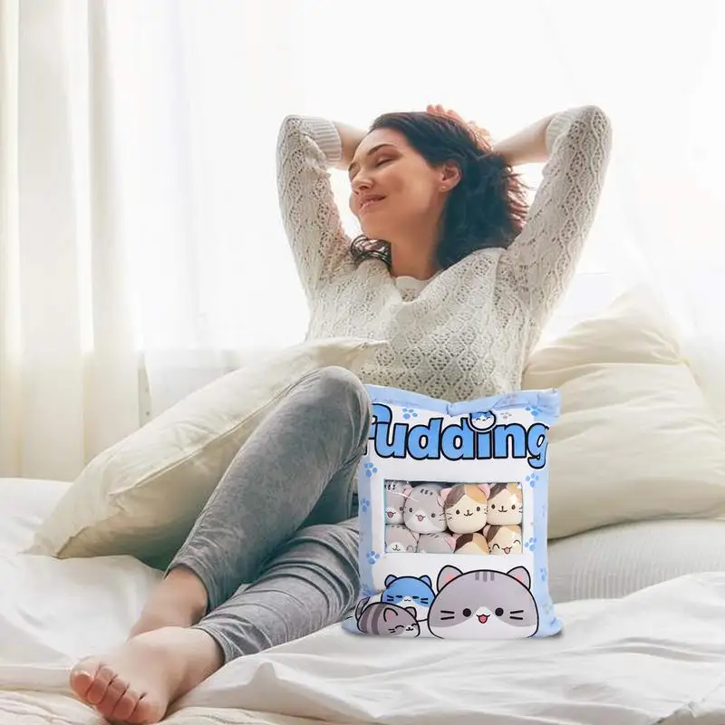 - Toy for Kids and Home Decor with Cute Cats: This snack pillow toy doubles as a throw pillow bag, containing 8 adorable cat plushies.