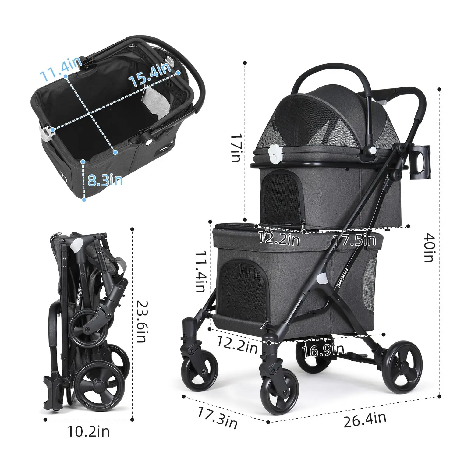 Easy Portability and Storage: A one-click folding mechanism allows the stroller to collapse into a compact size for easier storage in car trunks or indoor spaces. It also includes storage pockets and cup holders for carrying treats, water bottles, and other essentials.