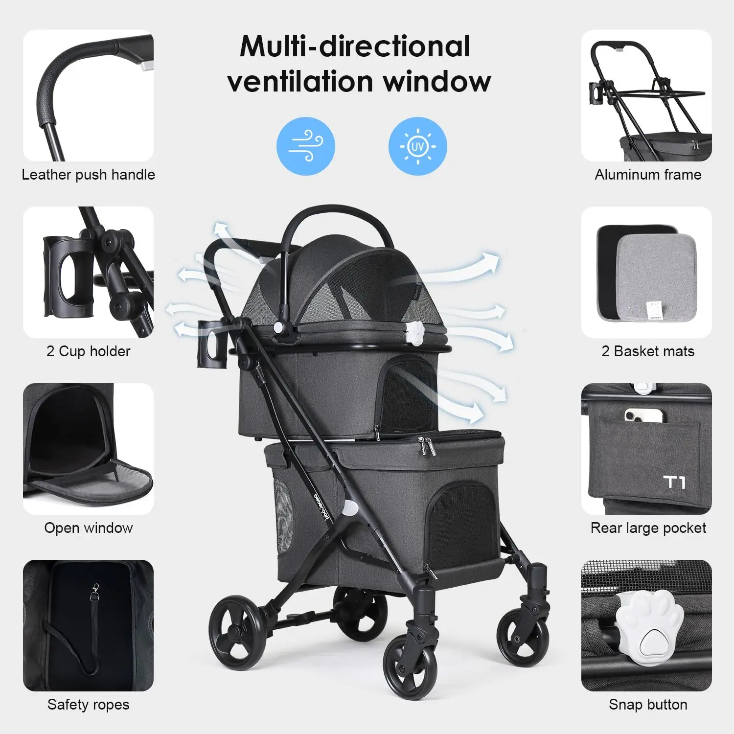 This double pet stroller is designed to provide comfort, safety, and convenience for small pets.