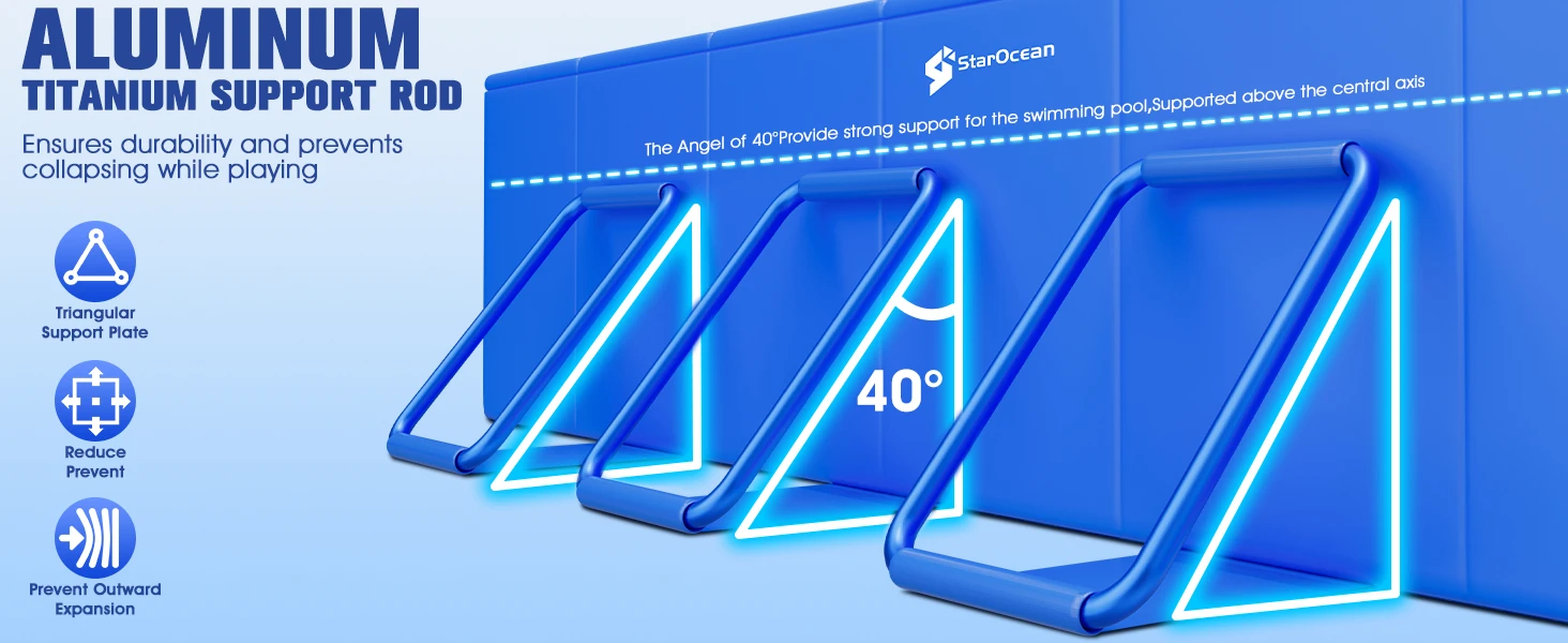 - Timeless Structural Stability: Built with high-grade aluminum poles in a 40° triangular support design based on structural mechanics, it supports a static load of up to 630 lbs evenly. It has also passed simulations of level 8 wind resistance. Unlike other inflatable pools that wobble, this foldable pool remains stable, offering unmatched sturdiness.
