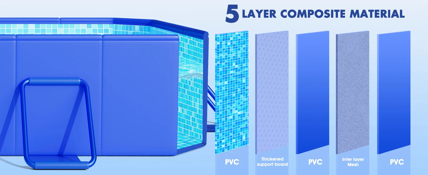 - Time-Tested Material Quality: Featuring a tensile strength of 530 PSI and a five-layer laminated vinyl combined with a high-modulus polyester mesh, this pool is far more advanced than outdated single-layer inflatable pools. Material fatigue tests show it can withstand over 12,000 stress cycles without failure, making it three times more durable than typical foldable pool materials. This ensures long-term durability, season after season.