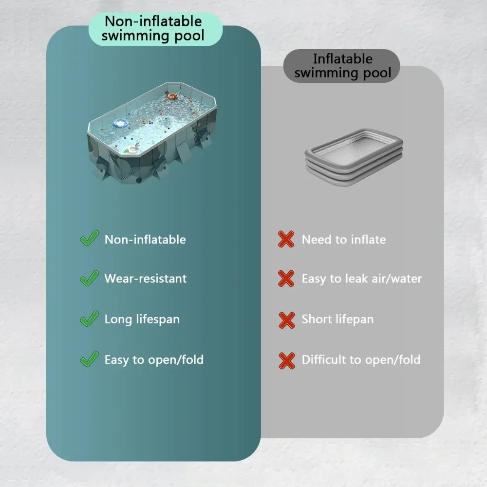 - Made from sturdy PVC material, our swimming pool is more durable and won’t leak air like traditional inflatable pools.