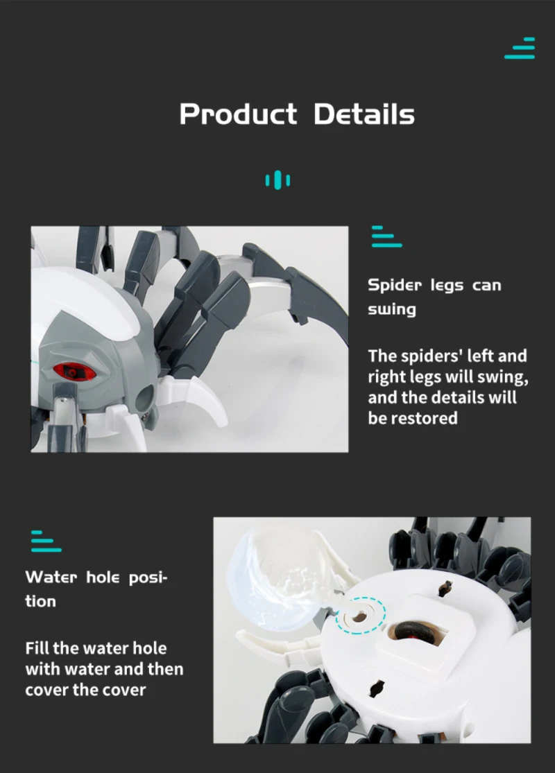 - Trick for All Ages: Suitable for children and adults, this spider toy features flashing red eyes and fangs that light up. It creates an eerie effect in the dark with blue and red mist, accompanied by music, making the spider seem to crawl realistically.