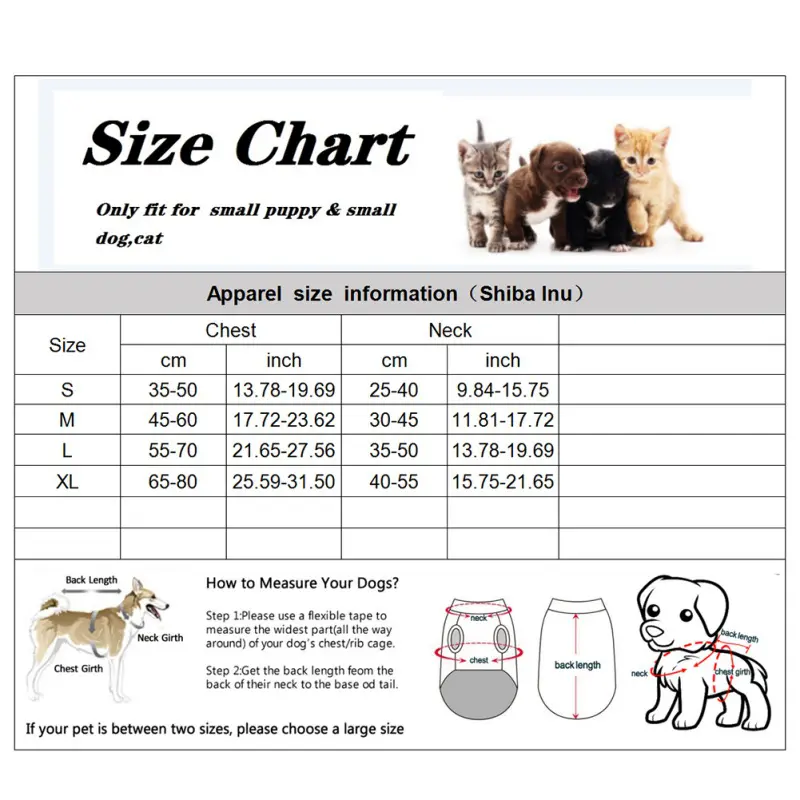 • S: Chest 35-50 cm / 13.8-19.7″, Neck 25-40 cm / 9.8-15.7″