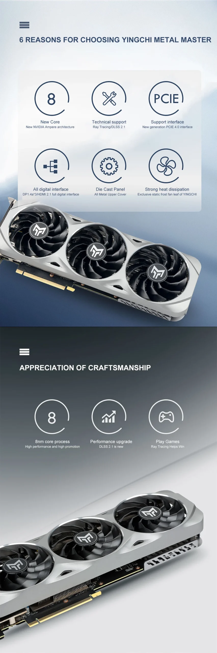 The YINGCHI RTX 3060 Metal Master OC is the perfect choice for gamers and creative professionals seeking top-tier performance and innovative cooling technology. From AAA gaming to high-resolution content creation, this GPU handles it all with style and power.