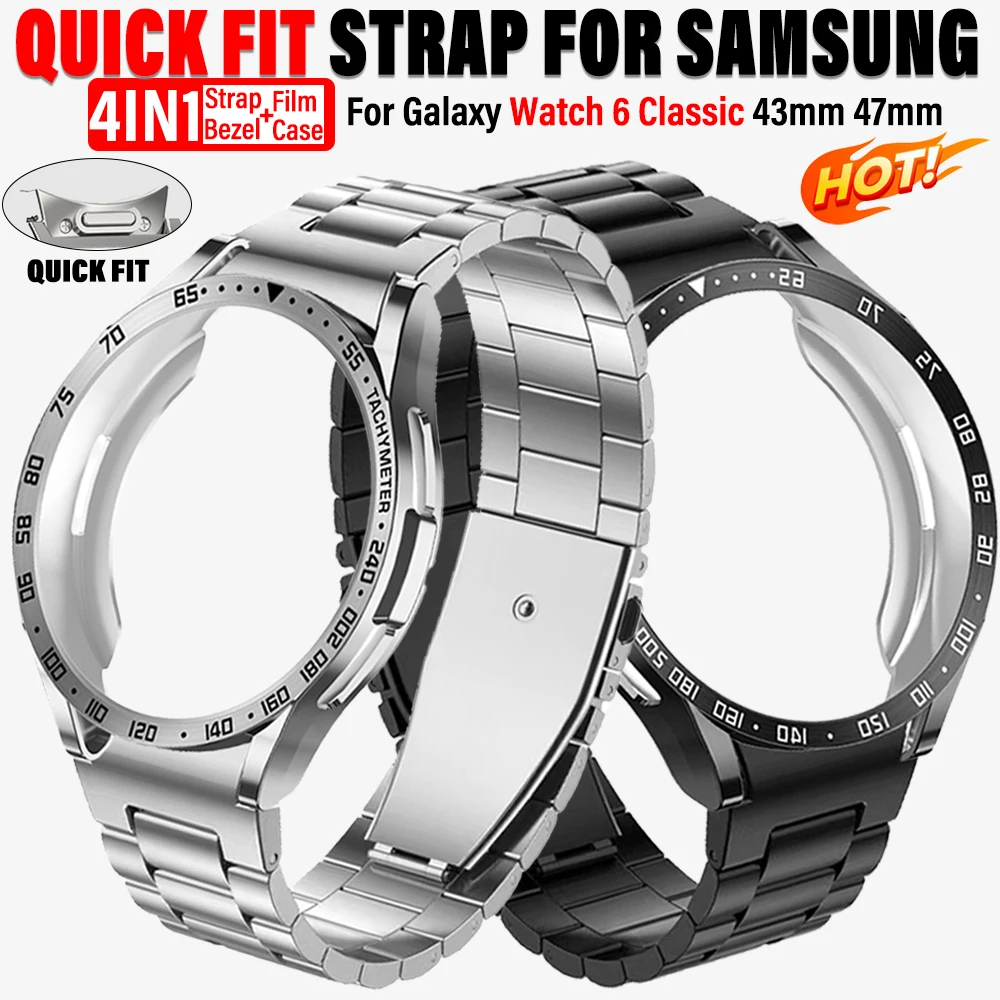 Elevate your Samsung Galaxy Watch6 Classic experience with the ultimate 4-in-1 Quick Fit Strap. Designed specifically for the 43mm and 47mm models, this premium accessory kit enhances both the functionality and aesthetics of your smartwatch. The package includes a sleek stainless steel strap that promises durability and comfort, ensuring your watch stays secure on your wrist through all activities. Accompanying the strap is a high-quality TPU case that provides robust protection against daily wear and tear, keeping your device looking pristine.