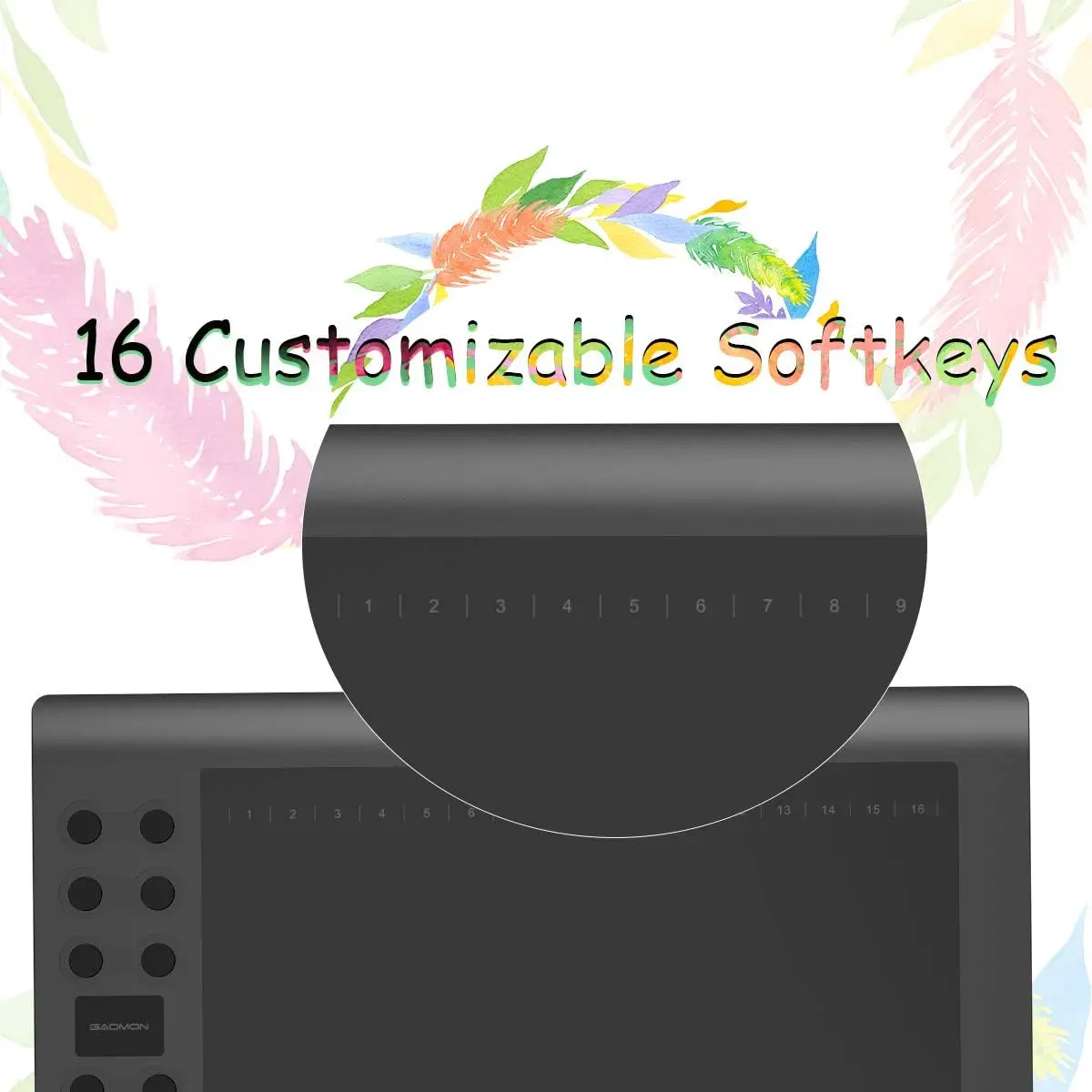 12 hot keys and 16 soft express keys can be programmed through the GAOMON tablet driver based on user preference, including functions such as eraser, zoom in or out, scrolling, and undo. The hot keys can still function even without the driver installed. A pen jacket on the side of the tablet helps store the stylus when not in use.