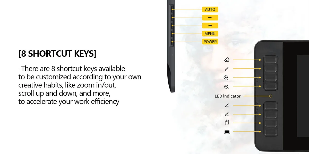 Eight side press keys on the display and two pen buttons can be programmed in the driver, giving you quick access to your favorite actions like brush size, zoom, undo, hand tool, and more.