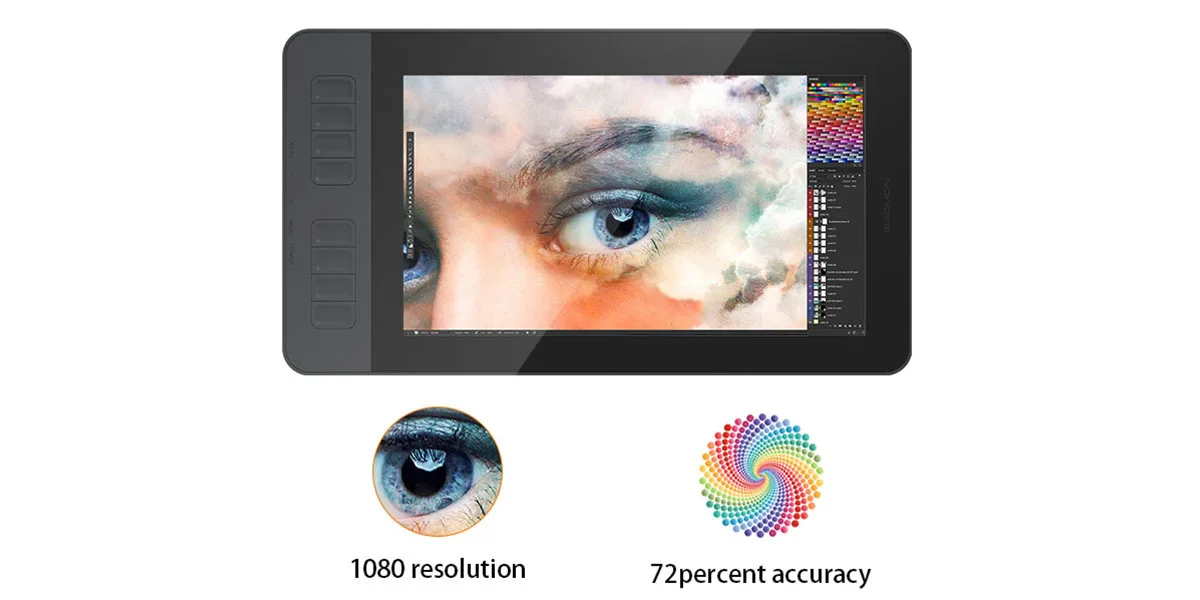 Screen resolution is 1920 x 1080 (16:9). It also supports 5080 LPI resolution and a 266 PPS report rate for responsive pen input. Active display area is 256.32 x 144.18mm (10.09 x 5.68 inches). Accuracy is ±0.5mm (center) and ±3mm (corner). Sensing height is 10mm. Signal output is Mini HDMI and Type-C.