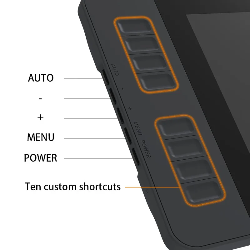 Customize 8 shortcut keys to match your workflow, such as zoom in and out, scroll, brush changes, and more. There are also 5 menu keys: AUTO, +, -, MENU, and POWER. These are located on the left side of the display and allow quick adjustments to settings like color, brightness, and contrast.