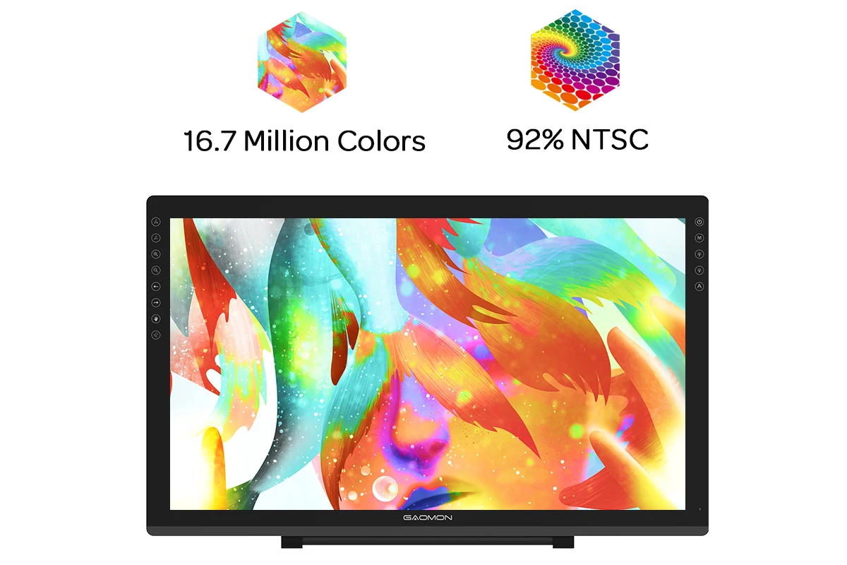 21.5-inch Full IPS HD Lamination Pen Display with 92% NTSC Gamut, 16.7M (8bit) million Colors gradation, 1920 x 1080 (16:9) solutions, and a viewing angle of 178°, it presents the lifelike details of your artwork with accuracy, delivers incredible visual clarity and color saturation.