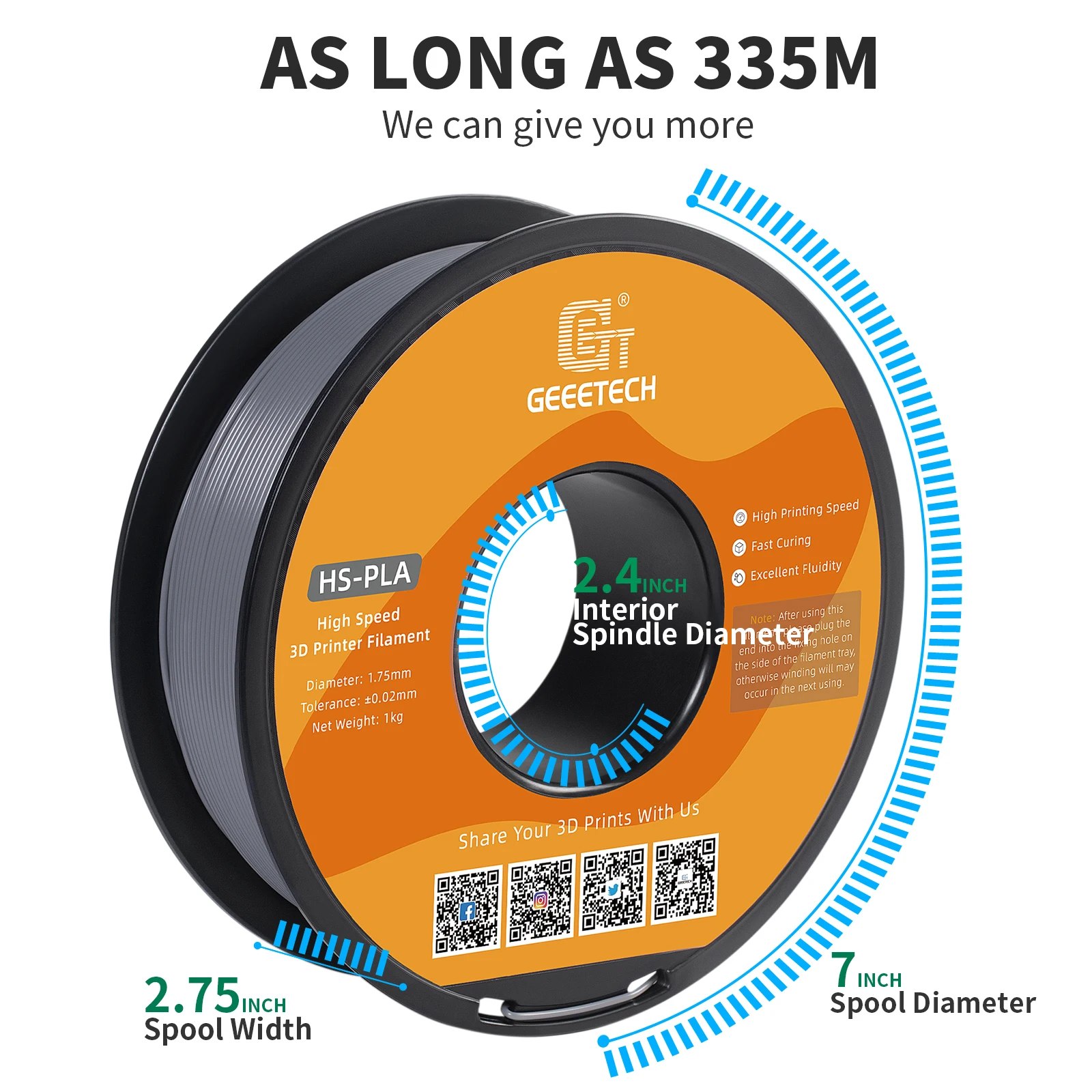 HS-PLA is Geeetech’s latest high-speed printing filament. By adjusting the melting point/index, glass transition temperature of raw materials, and optimizing the production process, Geeetech enables HS-PLA to have stronger fluidity, smoother discharge, faster curing and forming speed, and is not easy to deform under melting conditions.
