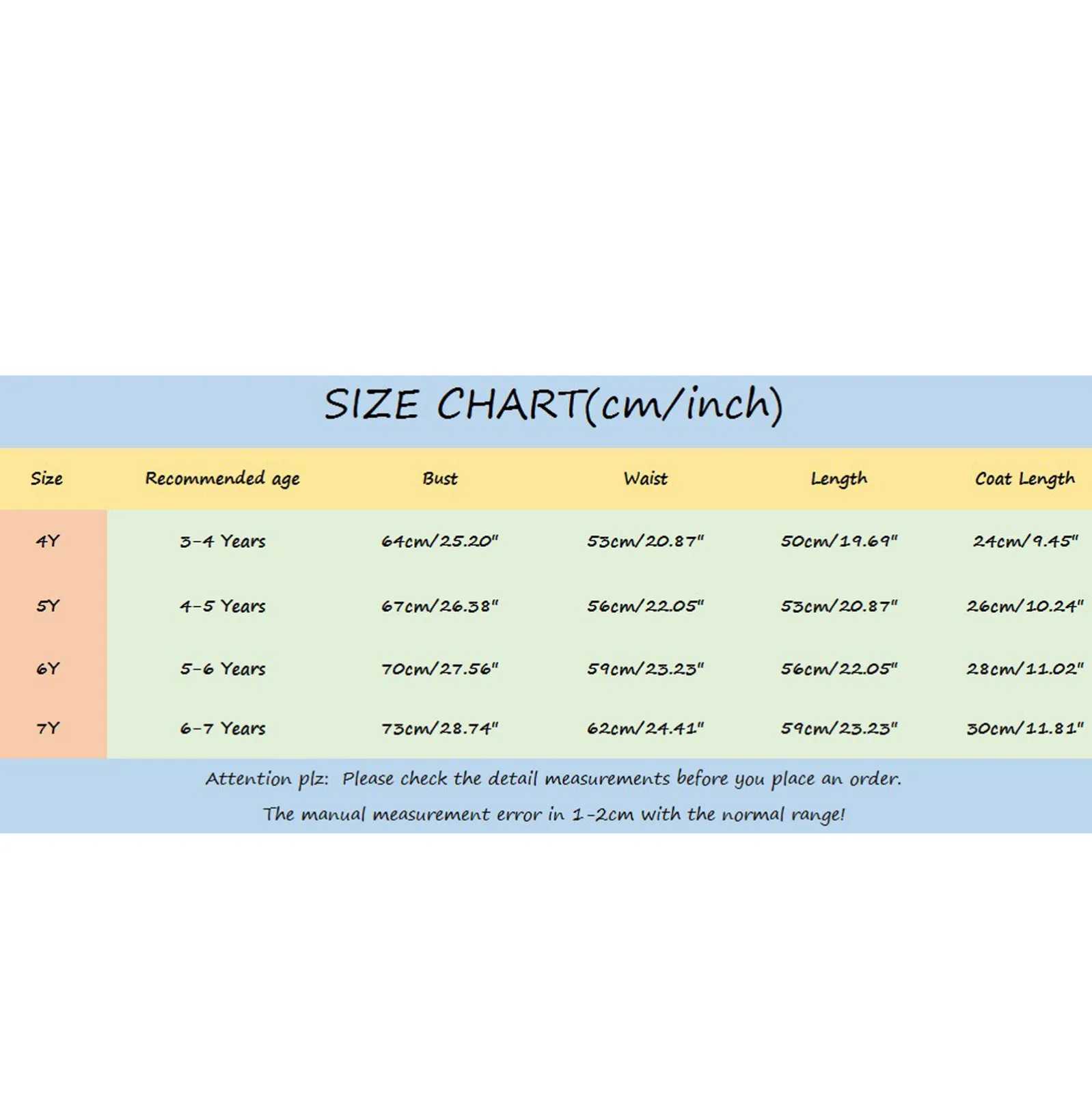 - 4Y (3-4 Years) – Bust: 64 cm/25.20”, Waist: 53 cm/20.87”, Length: 50 cm/19.69”, Coat Length: 24 cm/9.45”