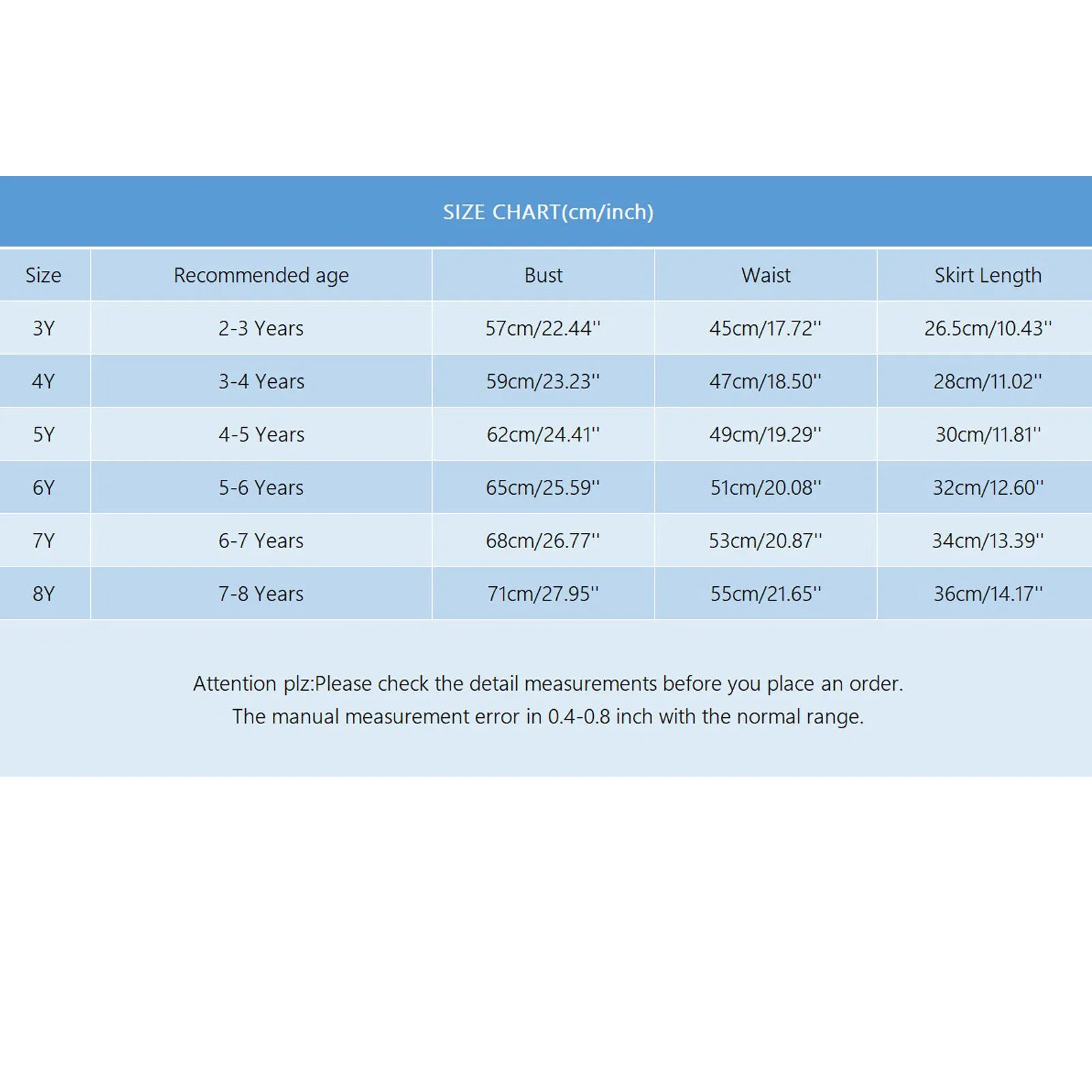 - Size 3Y (2-3 Years) – Bust: 57 cm/22.44”, Waist: 45 cm/17.72”, Skirt Length: 26.5 cm/10.43”