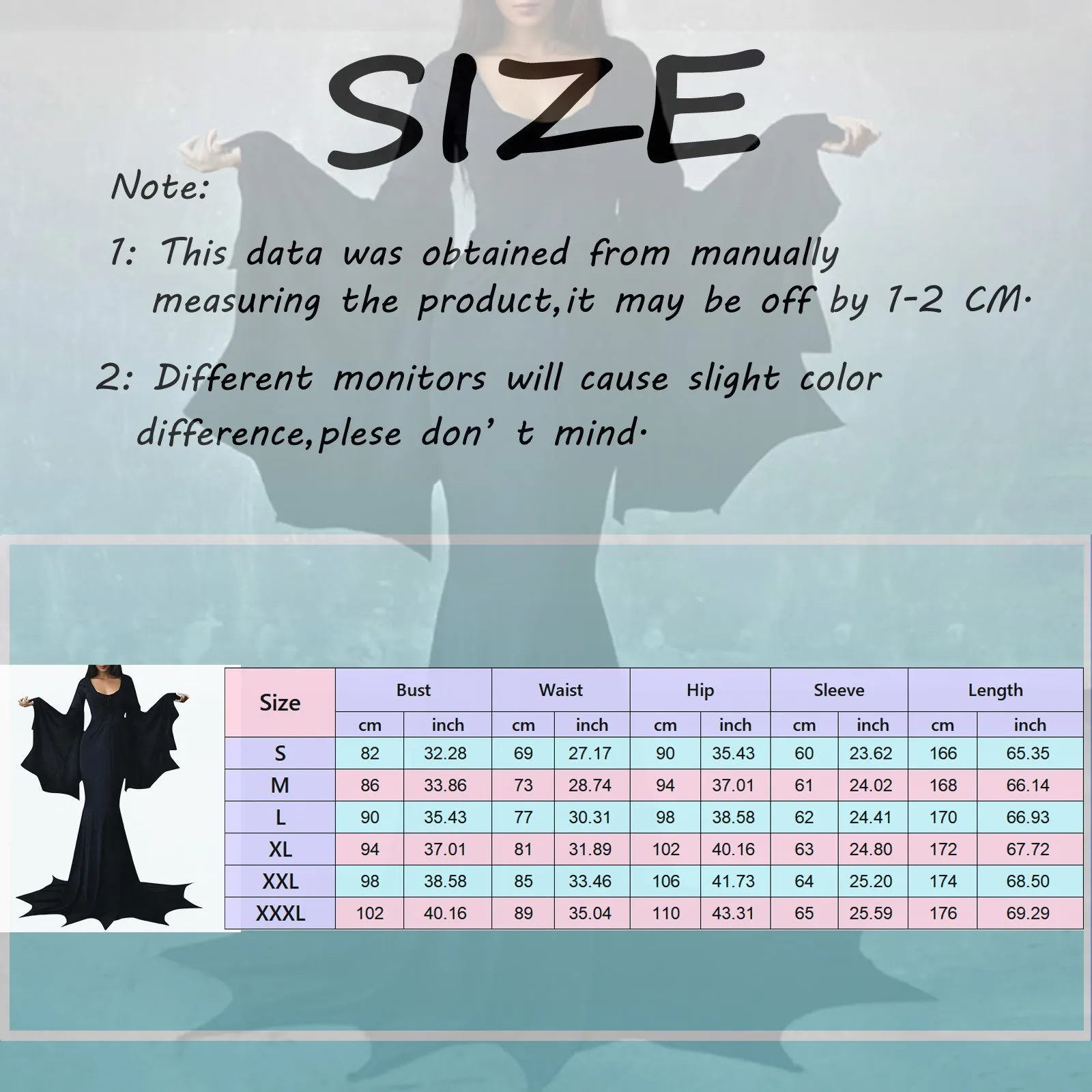 - Size XXL: Bust – 98 cm/38.58″, Waist – 85 cm/33.46″, Hip – 106 cm/41.73″, Sleeve – 64 cm/25.20″, Length – 174 cm/68.50″