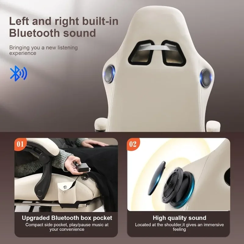 - Superior Design Features: 360° rotating multi-directional racing-car rollers. The maximum inclination angle of the backrest is 150°, with a retractable padded footrest and linkage armrests. When tired, you can pull out the footrest, recline the chair, connect to Bluetooth, and relax to enjoy 3D surround music. This office gaming chair is ideal for work, study, and entertainment.