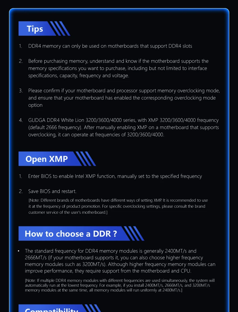 - Mixing unmatched memory modules may lead to compatibility problems or unstable performance