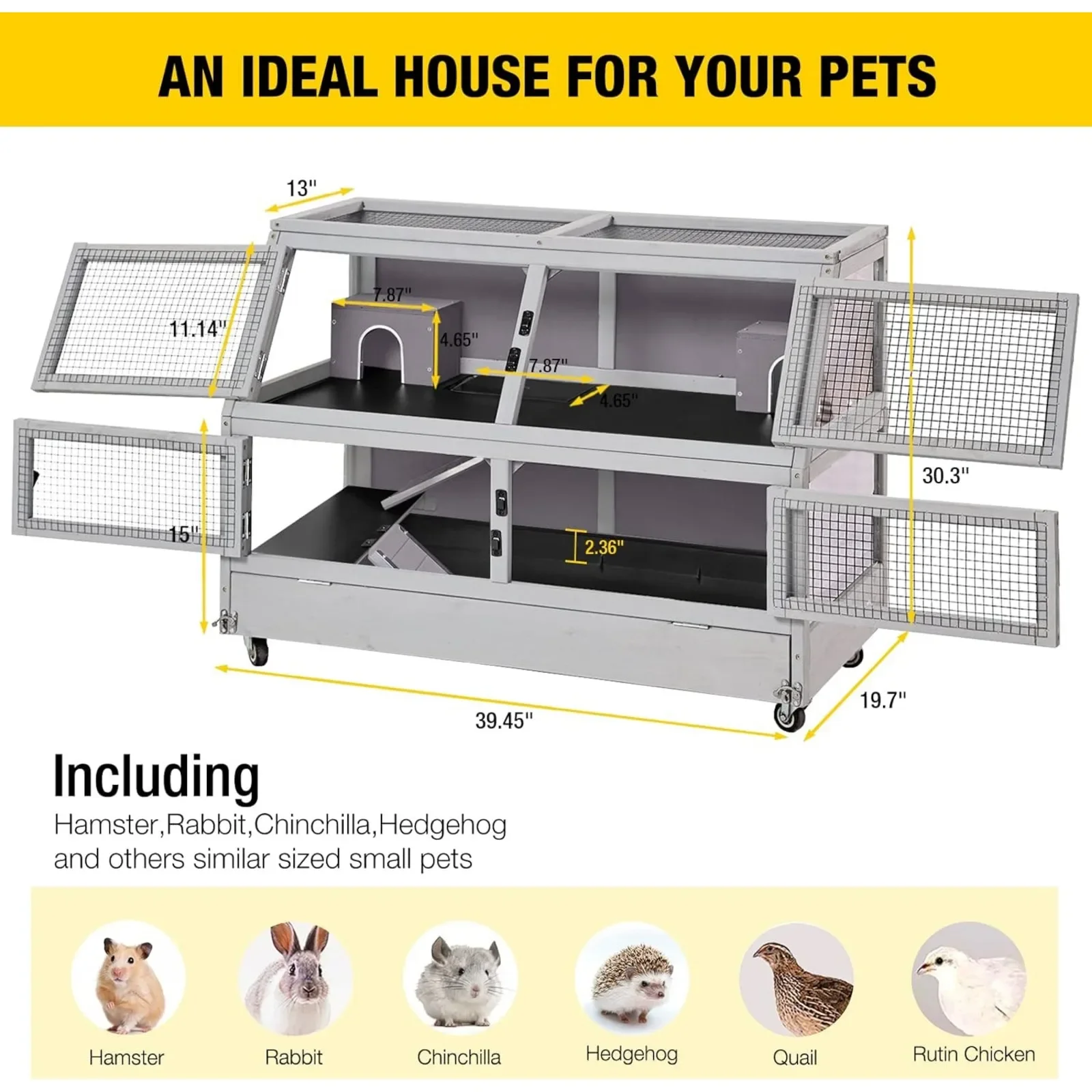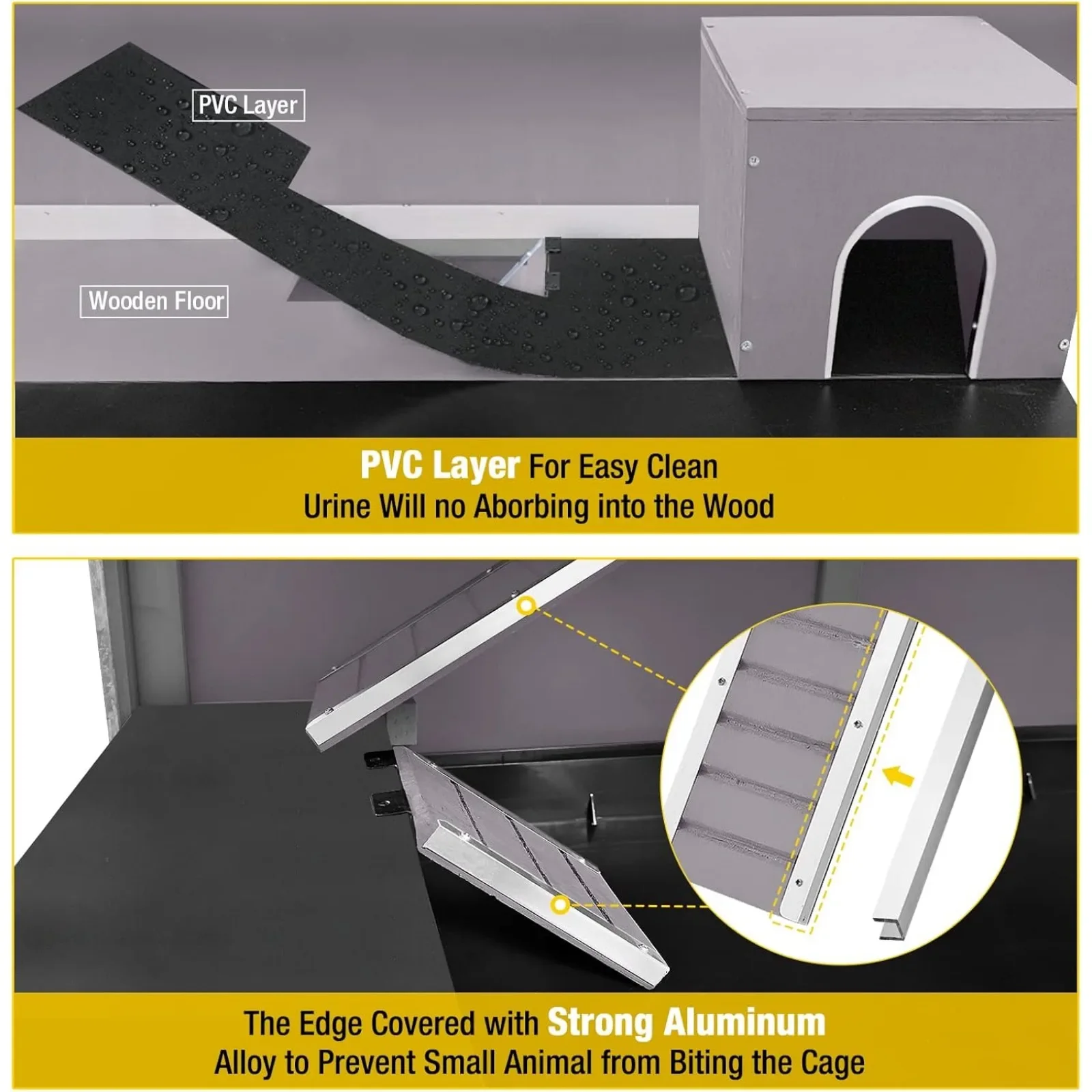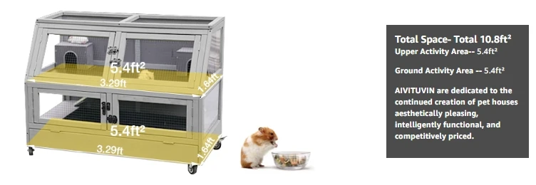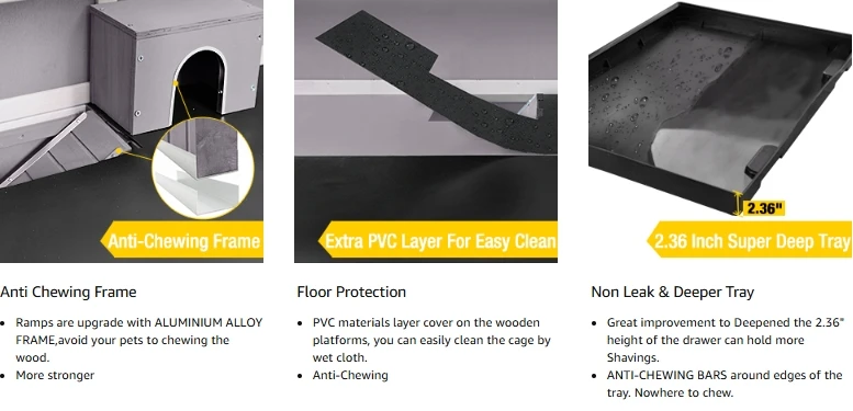 2.36″ Plastic Tray: Deepened and thickened plastic drawer providing enough depth for hay. Special baffles in the four corners prevent pets from chewing.