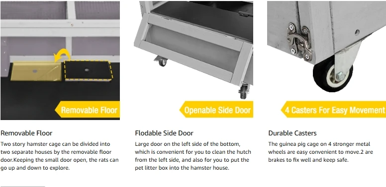 Rolling Cage: Equipped with four strong metal wheels for easy mobility. Two wheels have brakes to secure the cage safely. Suitable for guinea pigs, hamsters, rats, mice, and hedgehogs.